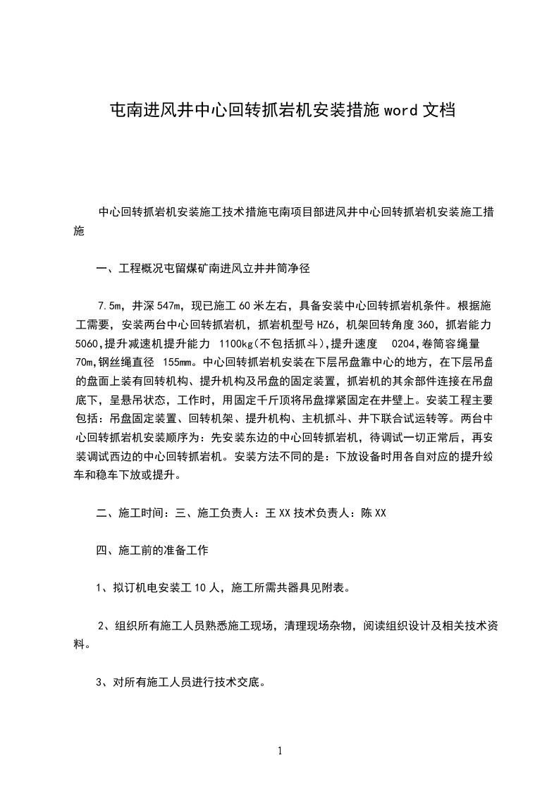 中心回转抓岩机安装施工技术措施屯南项目部进风井中心回转抓岩机安装施工措施
