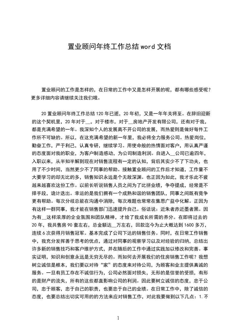 20置业顾问年终工作总结120年已逝,20年初,又是一年年关将至。在辞旧迎新的这个契机里,20年对于__,对于楼市,对于__房地产开发有限公司,还有对于我,都是充满希望的一年。我深知个人的发展离不开公司的发展,而热爱则是做好每件工作所不可缺的。所以,在这充满希望的新一年里,我必将全力服务公司。热爱岗位,勤奋工作,严于利己,认真专研,继续学习。用使命般的热情面对客户,用认真严谨的态度面对我的职业,为客户制造感动,为公司制造利润。自进入__公司已逾四年,入职以来,从半知半解到现在对销售流程有一定的认知,背后其实少不了下功夫,也用了不少时间,当然更少不了同事的帮助。接触置业顾问的工作后才知道,工作量不大要学习的却无比的多,销售知识永远是个无敌深渊。也正因为如此,我才乐此不疲,越来越喜欢这份工作。以前长听说销售人员之间为了比拼业绩,争夺提成,经常是不择手段,诡计迭出。幸运的是我们拥有一个成熟和谐的销售团队,同事之间既有竞争更有帮助。每次分歧总能在沟通中消除,每次难题也常常在集思广益中化解。正因为有这样一群同事,我才能在销售部门迅速提升自己。俗话说:近朱者赤近墨者黑。因为有__这样浓厚的企业氛围和团队精神,才给了我成长所需的养分。在即将过去的20年,我共售房90套左右,总金额达__万左右,回款迄今为止大概达到1600多万,连续6次获得月销售冠军。基本完成了公司下达的销售任务。同时,在日常工作销售中,我充分发挥善于思考的优点,通过对同事的观察学习以及对经验的归纳,总结出许多新的销售技巧和客户维护方式,并在随后的工作中通过实践加以修改和完善。事实证明,知识和创意永远是无穷无尽的。而如何去开展我们的住房销售工作呢?我想树立诚信是根本,我们要以对待“家”的态度来对待公司,为顾客和业主提供真诚的服务。一旦有员工存在不诚信行为,公司必然面对损失,无形的是信誉的受损,有形的是财产的流失,所有的这些都直影响公司的利润。因此要树立诚信的态度,忠于公司,忠于顾客,忠于自己的职责,也要忠于自己的业绩。在日常工作中,除了诚信的态度,也要总结出切实可用的的方法来应对销售工作,对此我要做到以下几点:1.不做作,以诚相待,客户分辨的出真心假意。得到客户信任,客户听你的,反之你所说的一切都将起到反效果。