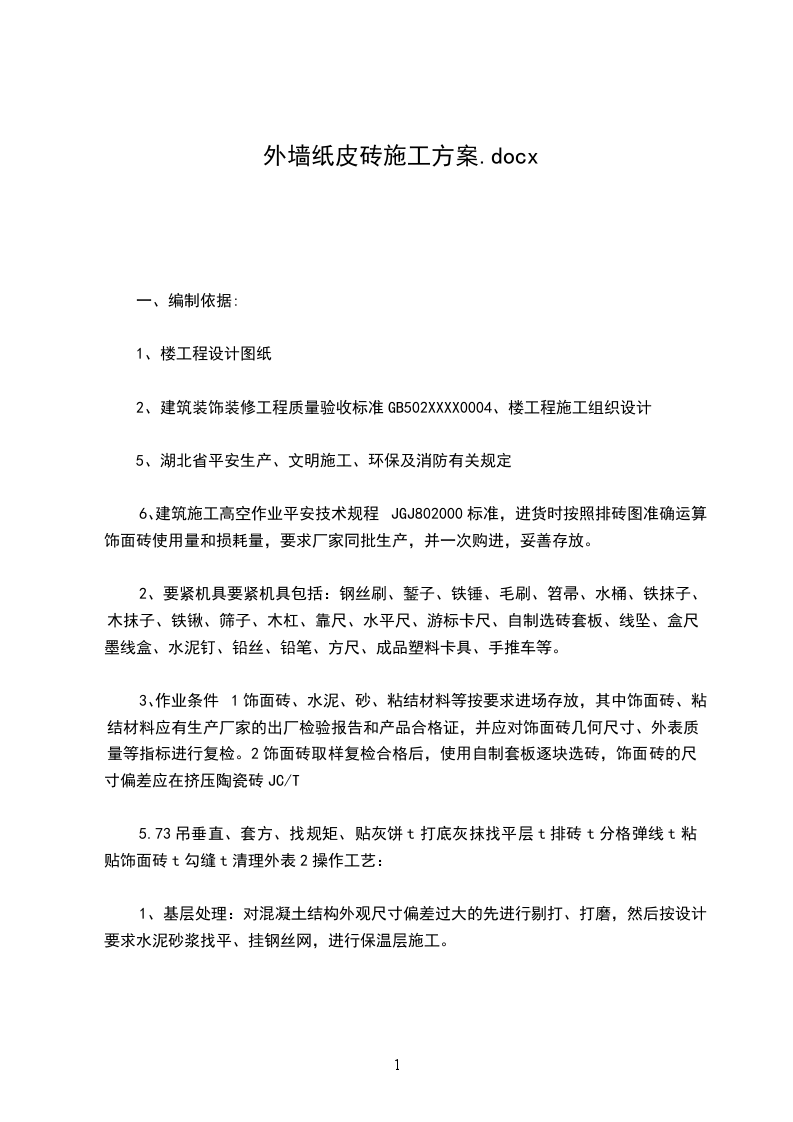 (1)工艺流程:混凝土基层处理挂钢网甩浆吊垂直套方找规矩打灰饼抹找平层刮底灰排砖分格弹线粘贴纸皮砖填缝清理表面;