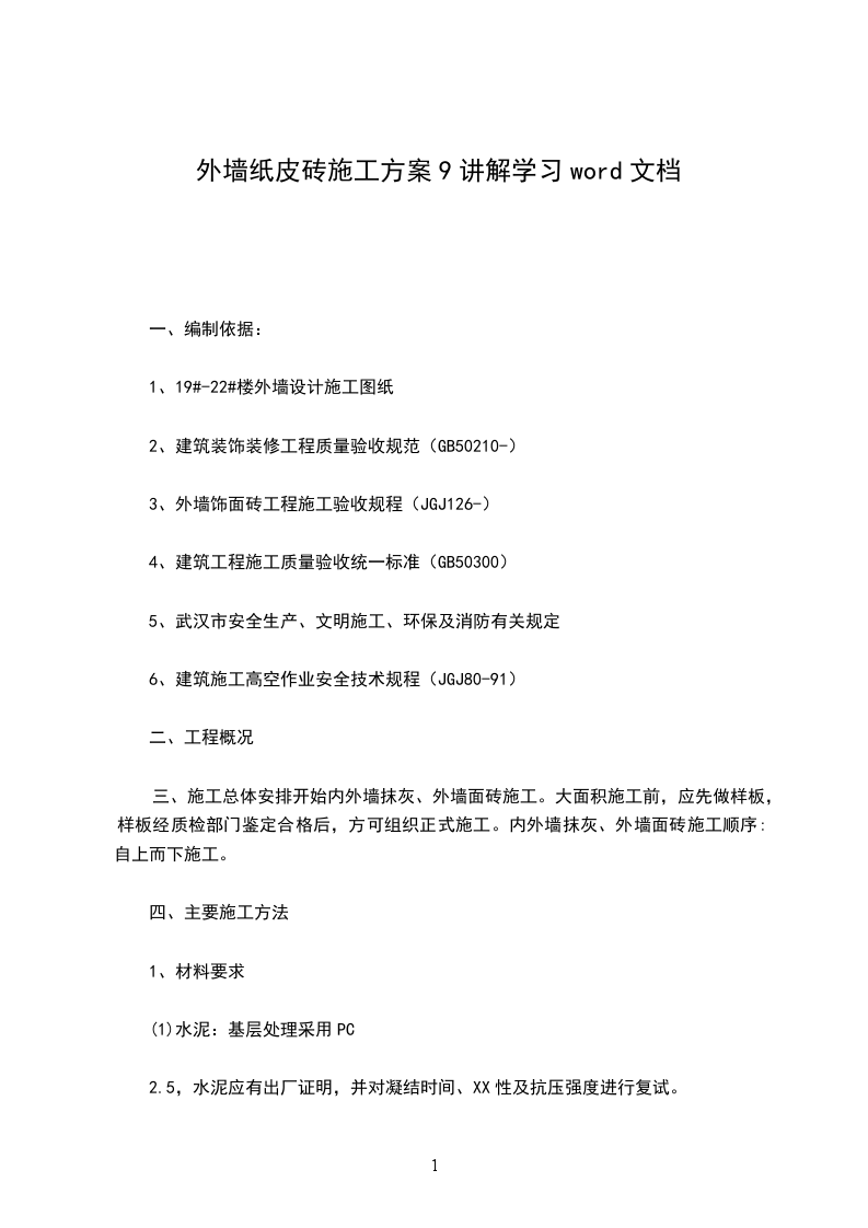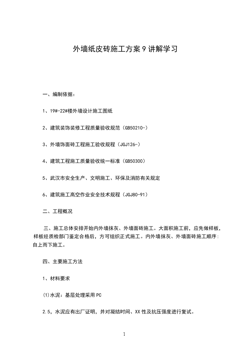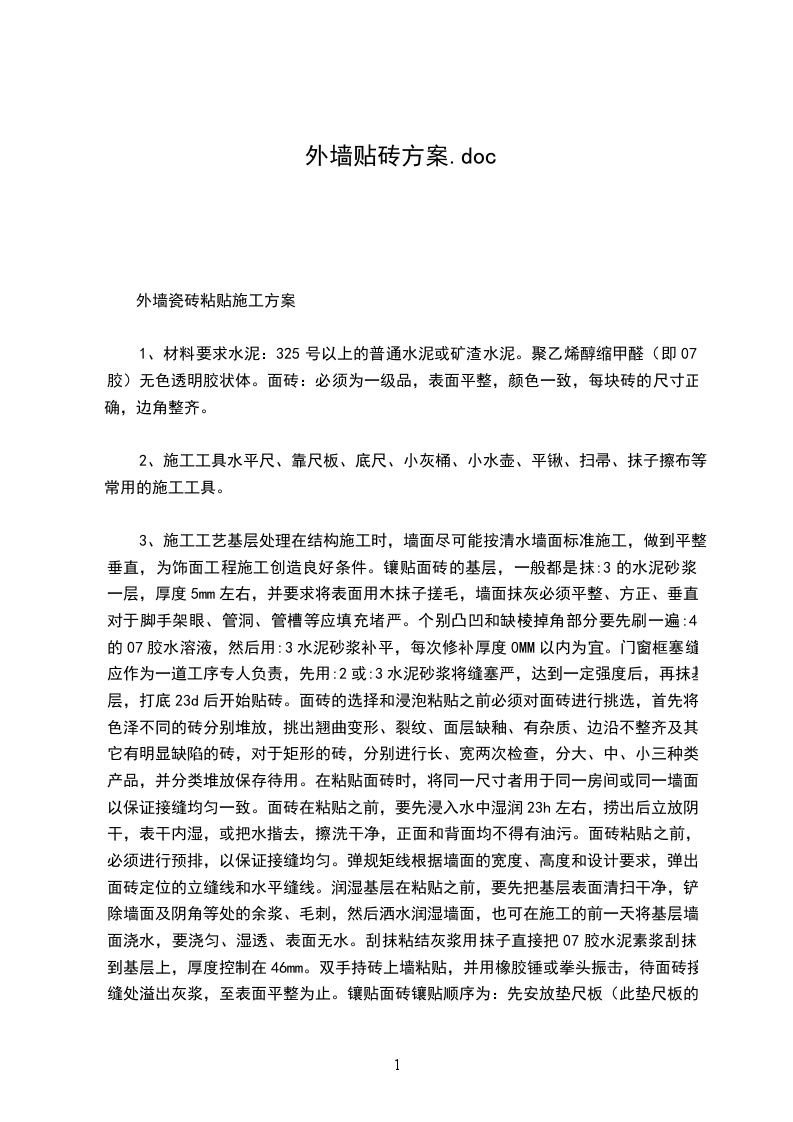 三、施工总体安排开始内外墙抹灰、外墙面砖施工。大面积施工前,应先做样板,样板经质检部门鉴定合格后,方可组织正式施工。内外墙抹灰、外墙面砖施工顺序:自上而下施工。