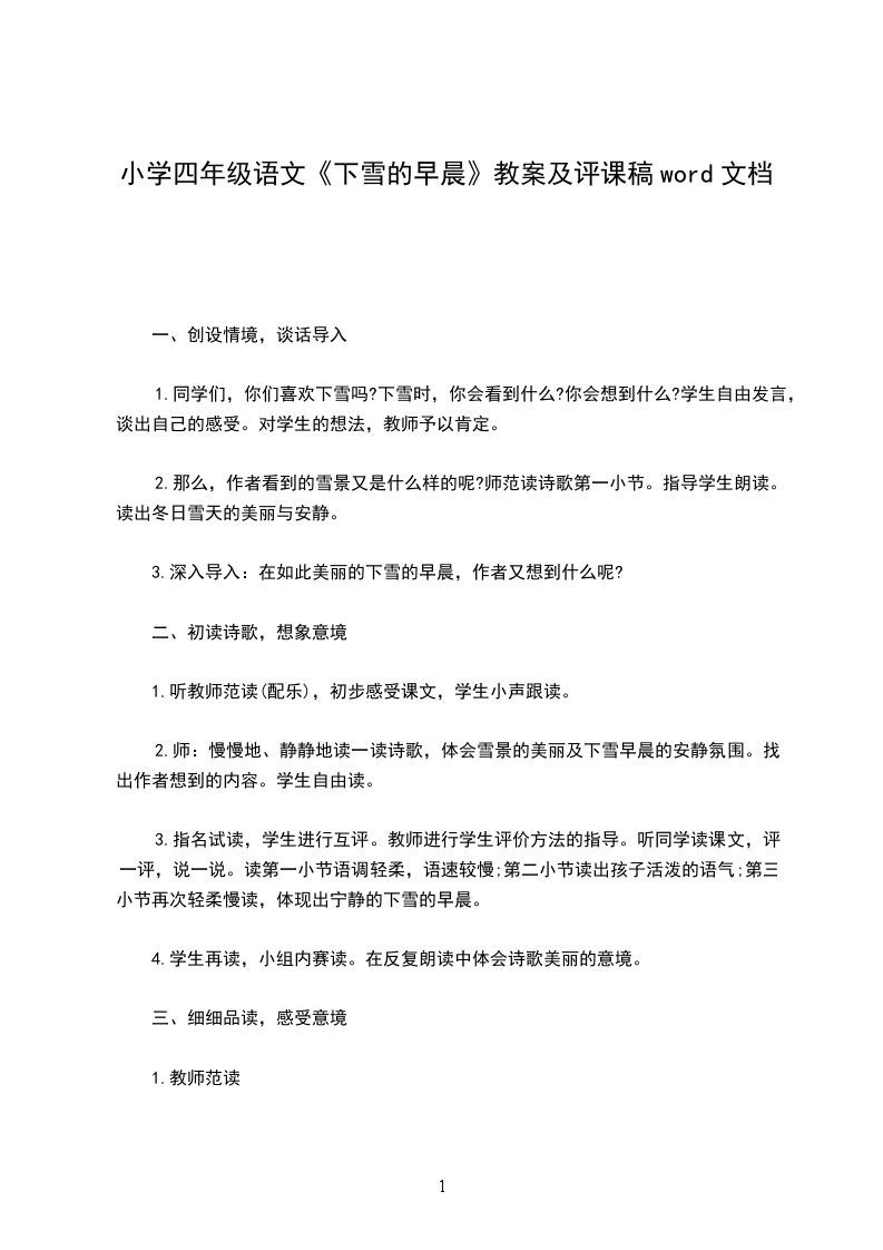 四、注重启发学生的想象和想。在第1小中,罗XX启学生想像雪的世界是什么样的,引生入境。读第2小想像孩子在林中玩耍的情景,感受孩子的可。并想象自己入夏天的林会怎么玩耍?激起感情的共鸣,体会孩子的快乐。第3小,他想像这个孩子是谁?诗人为什么会在个下雪的早晨想到他?老尽量激学生大胆想像,力求他通过丰富的想像去演绎诗人的情感。将自己的情感经验,与诗歌中的情感经验进行比,从而产生共鸣,使之化自己的情感内存。此外,我认为这堂课还有很多闪光点,比如教师的渡言设计精妙,教学环节过渡自然,环环相扣;课件制作精美,利用件激学生的想象思能力;课堂上关注全体学生,尊重个体体验。当然,这堂在宁静中有一份激情,整节课流淌着诗意,真的是很美很美!