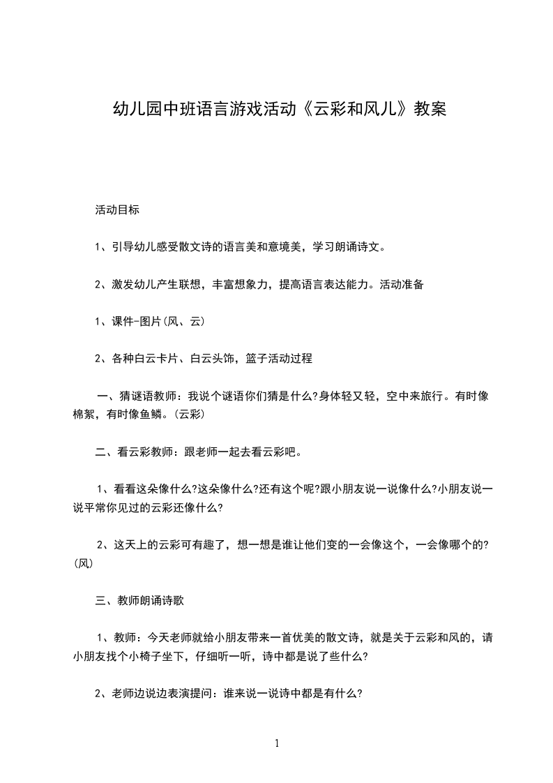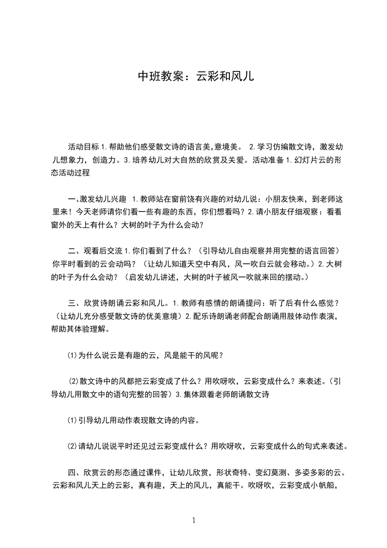 四、活动结束你们这些云朵变得真漂亮,外面的云彩更美丽,咱们让它们也和我们一起来变一变,好吗?云彩和风儿天上的云彩真有趣,天上的风儿真能干。吹呀吹,云彩变成了小青蛙,呱呱呱,蹲在荷叶上,忙着捉害虫。吹呀吹,云彩变成了小花猫,长长的胡子,大大的眼睛,跑来跑去捉老鼠。吹呀吹,云彩变成了小蜻蜓,圆圆的眼睛,大大的翅膀,飞呀飞,跟着月亮婆婆捉迷藏。吹呀吹,云彩变成了小花狗,汪XX,坐在门口啃骨头。活动目标