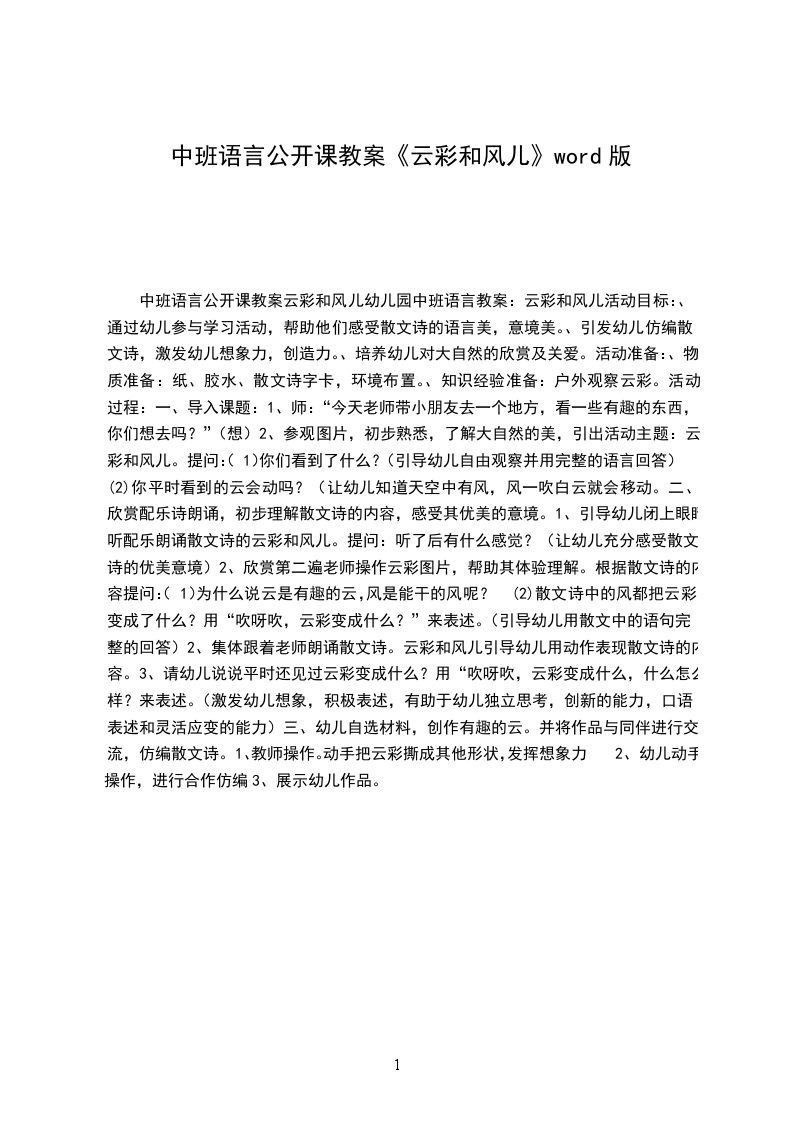3、与散文诗有关的图片。活动过程:一:引出漂亮的云彩导语:小朋友们,今天,老师请来了一位漂亮的客人,让我们用好听的声音把它请出来,好吗?(出示云宝宝的图片)。小朋友们,你们喜欢天上的云彩吗?云彩宝宝可调皮了,它是一个魔术师,一会变成这,一会变成那,你们猜一猜云彩会变成什么样子呢?今天老师给你们带来一首关于云彩的散文诗云彩和风儿,听一听,看一看,散文诗里的云彩变成了什么?