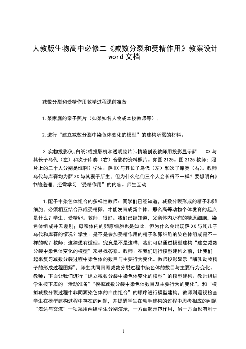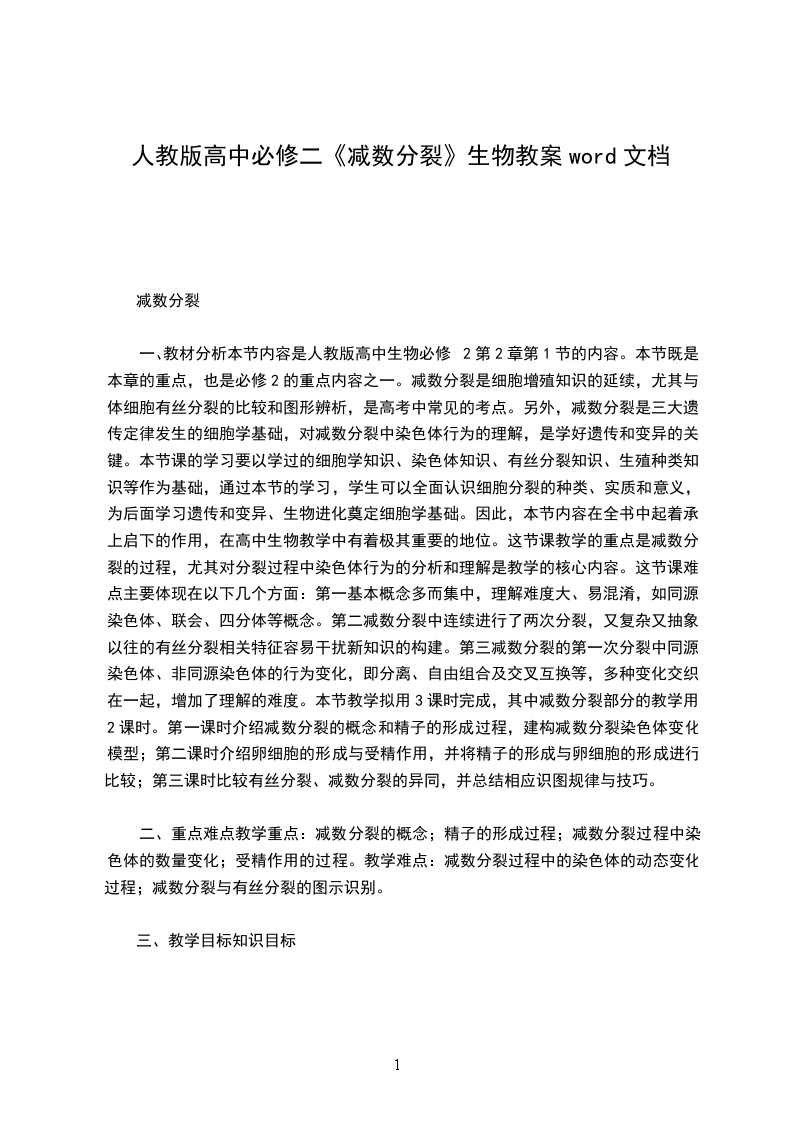 一、教材分析本节内容是人教版高中生物必修2第2章第1节的内容。本节既是本章的重点,也是必修2的重点内容之一。减数分裂是细胞增殖知识的延续,尤其与体细胞有丝分裂的比较和图形辨析,是高考中常见的考点。另外,减数分裂是三大遗传定律发生的细胞学基础,对减数分裂中染色体行为的理解,是学好遗传和变异的关键。本节课的学习要以学过的细胞学知识、染色体知识、有丝分裂知识、生殖种类知识等作为基础,通过本节的学习,学生可以全面认识细胞分裂的种类、实质和意义,为后面学习遗传和变异、生物进化奠定细胞学基础。因此,本节内容在全书中起着承上启下的作用,在高中生物教学中有着极其重要的地位。这节课教学的重点是减数分裂的过程,尤其对分裂过程中染色体行为的分析和理解是教学的核心内容。这节课难点主要体现在以下几个方面:第一基本概念多而集中,理解难度大、易混淆,如同源染色体、联会、四分体等概念。第二减数分裂中连续进行了两次分裂,又复杂又抽象,以往的有丝分裂相关特征容易干扰新知识的构建。第三减数分裂的第一次分裂中同源染色体、非同源染色体的行为变化,即分离、自由组合及交叉互换等,多种变化交织在一起,增加了理解的难度。本节教学拟用3课时完成,其中减数分裂部分的教学用2课时。第一课时介绍减数分裂的概念和精子的形成过程,建构减数分裂染色体变化模型;第二课时介绍卵细胞的形成与受精作用,并将精子的形成与卵细胞的形成进行比较;第三课时比较有丝分裂、减数分裂的异同,并总结相应识图规律与技巧。