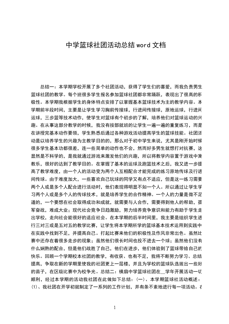 总结一:本学期学校开展了多个社团活动,获得了学生们的喜爱,而我负责男生篮球社团的教学。每个班很多学生报名参加篮球社团都非常踊跃,表现出了很高的积极性。本学期我根据学生的身体特点安排了以掌握基本篮球技术为主的教学内容。本学期前半段时间,主要是让学生学习胸前传接球,行进间传接球,原地运球,行进间运球,三步篮等技术动作,使学生对篮球有个初步的了解,培养他们对篮球运动的兴趣。在从事这部分教学的时候,我没有按部就班的让学生一遍一遍的重复练习,而是在讲授完基本动作要领,学生熟悉后通过各种游戏活动提高学生的篮球技能。社团活动是以培养学生的兴趣为主教学目的的,那么对于初中学生来说,尤其是刚开始时候很多学生基本功都很差,连一些简单的动作也不会,然而好多男生就想打对抗赛,这显然是不科学的,是我就通过游戏来激发他们的兴趣,所以将教学内容置于游戏中寓教乐,很好的达到了教学目的。在掌握了基本的运球及跑篮技术之后,我又进一步提高了教学难度,由一个人的活动变为两个人互相配合才能完成的练习原地传球及行进间传球。由于难度加大,一些喜欢自己玩球的同学又有点不适应,但是这一练习需要两个人或是多个人配合进行活动时,他们表现得明显不如一个人。所以通过让学生学习两个人或是多个人的传球技术,就是培养学生的合作精神。一个人的力量是微不足道的,一个要想在社会取得成功和成就,就需要与人合作,需要得到他人的帮助,孤军奋战,难成大业;现代社会竞争日趋激励,努力培养竞争意识和能力有助于学生走出学校,走向社会能很好的适应社会。在本学期的后半时间里,我主要是组织学生进行三对三或是五对五的教学比赛,让学生将本学期所学的篮球基本技术运用到实践中。在实践中找到不足,并提高自己。打起比赛来他们的积极性及作风非常出色。虽然比赛中还存在着很多走步的现象;虽然他们很长时间也投不进去一个球;虽然他们没有什么娴熟的配合,但是他们战胜了自己,他们在进步,他们体验到了篮球带给自己的快乐。回顾一个学期校本社团的教学,有收获、也有不足,我将不断努力学习、总结、提高,争取在新的学期里使我的社团更上一层楼,并且为学校的篮球队选拔出一些好的苗子,在区级比赛中为校争光。总结二:横扇中学篮球社团在__学年开展活动一切顺利,经过本学期的活动我社团在此做如下总结:(一)、本学期篮球社活动概述:(1)、我社团在开学初就制定了一系列的工作计划,并有条不紊地进行每一项活动。在开学初,我社团就选出了社长、小组长等社团干部成员,以更好地投入到社团工作中去。在工作过程中,干部认真负责,为社团活动的良好进行提供了保障。