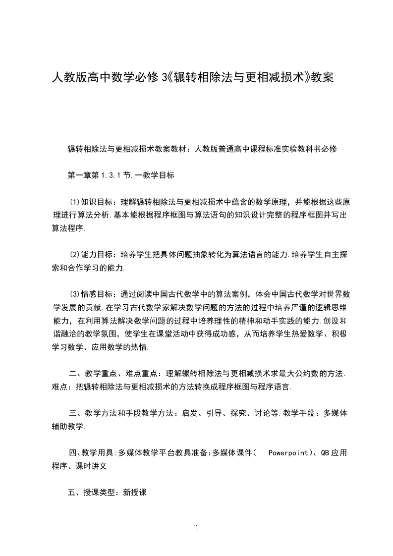辗转相除法与更相减损术教案教材:人教版普通高中课程标准实验教科书必修