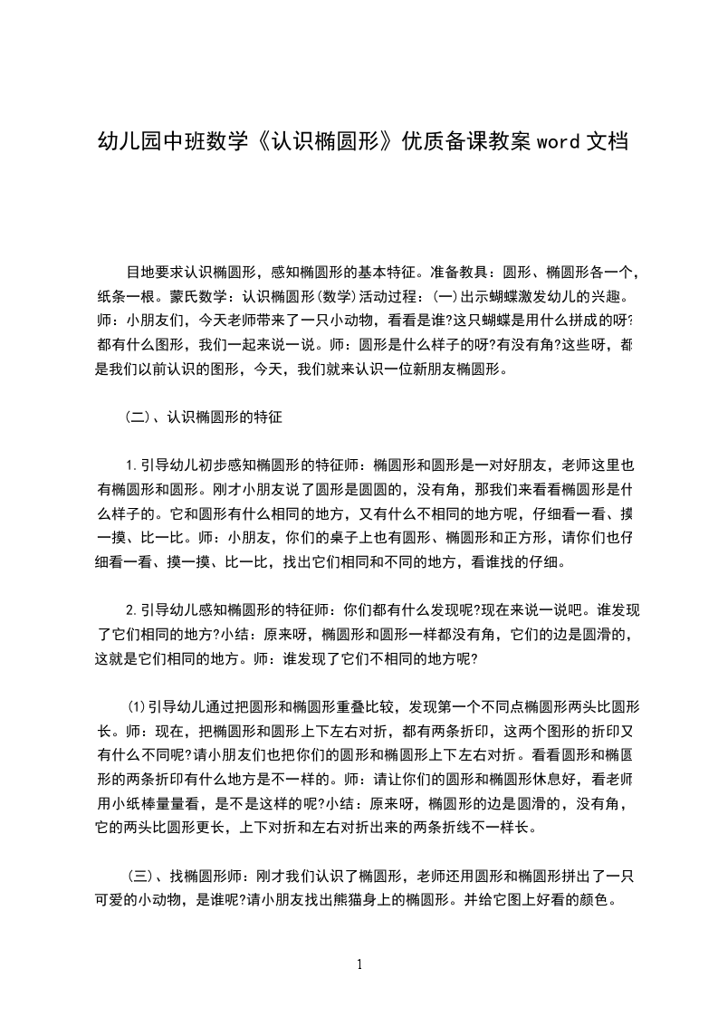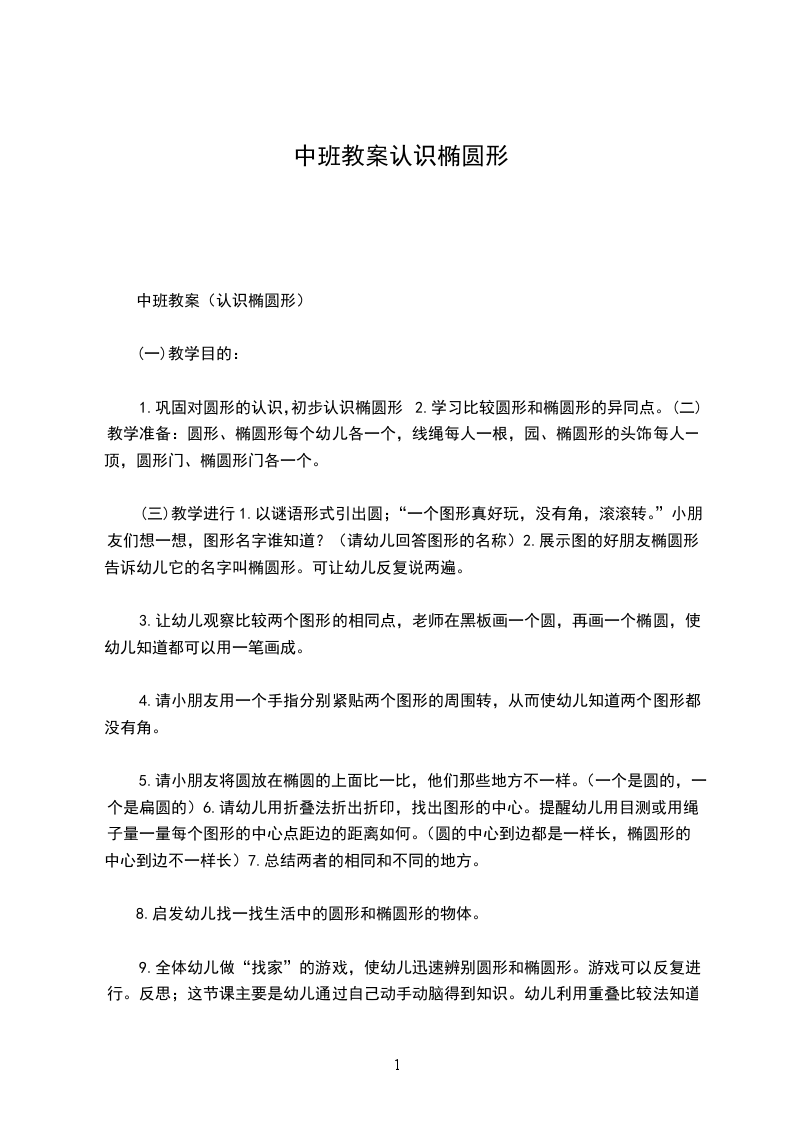 2、指导幼儿观察认识椭圆形的形状,并正确为椭圆形命名。二:操作比较讨论找出椭圆形的特征