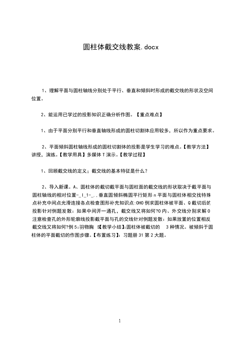 2、导入新课。A、圆柱体的截切截平面与圆柱面的截交线的形状取决于截平面与圆柱轴线的相对位置-_I_1-_.,垂直圆倾斜椭圆平行矩形n平面与圆柱体相交找特殊点补充中间点光滑连接各点检查图形补充知识点:OHO例求圆柱体被平面、Q截切后的投影针对例题发散:如果中间开一通孔,截交线又将如何?O内、外交线分别求解O注意检查孔的外形轮廓线投影截平面与孔的交线针对例题发散:如果放置的位置相反,截交线又将如何?例5:羽物胸S【教学小结】:圆柱体被截切的3种情况。被倾斜于圆柱体的平面截切的作图步骤。【布置练习】:习题册31第2大题。