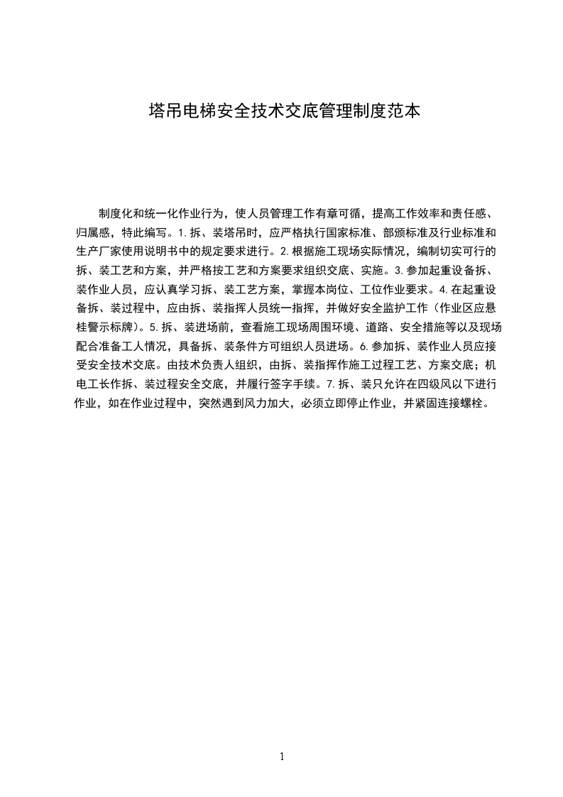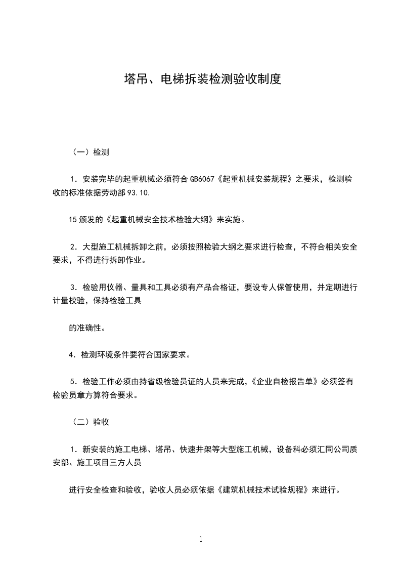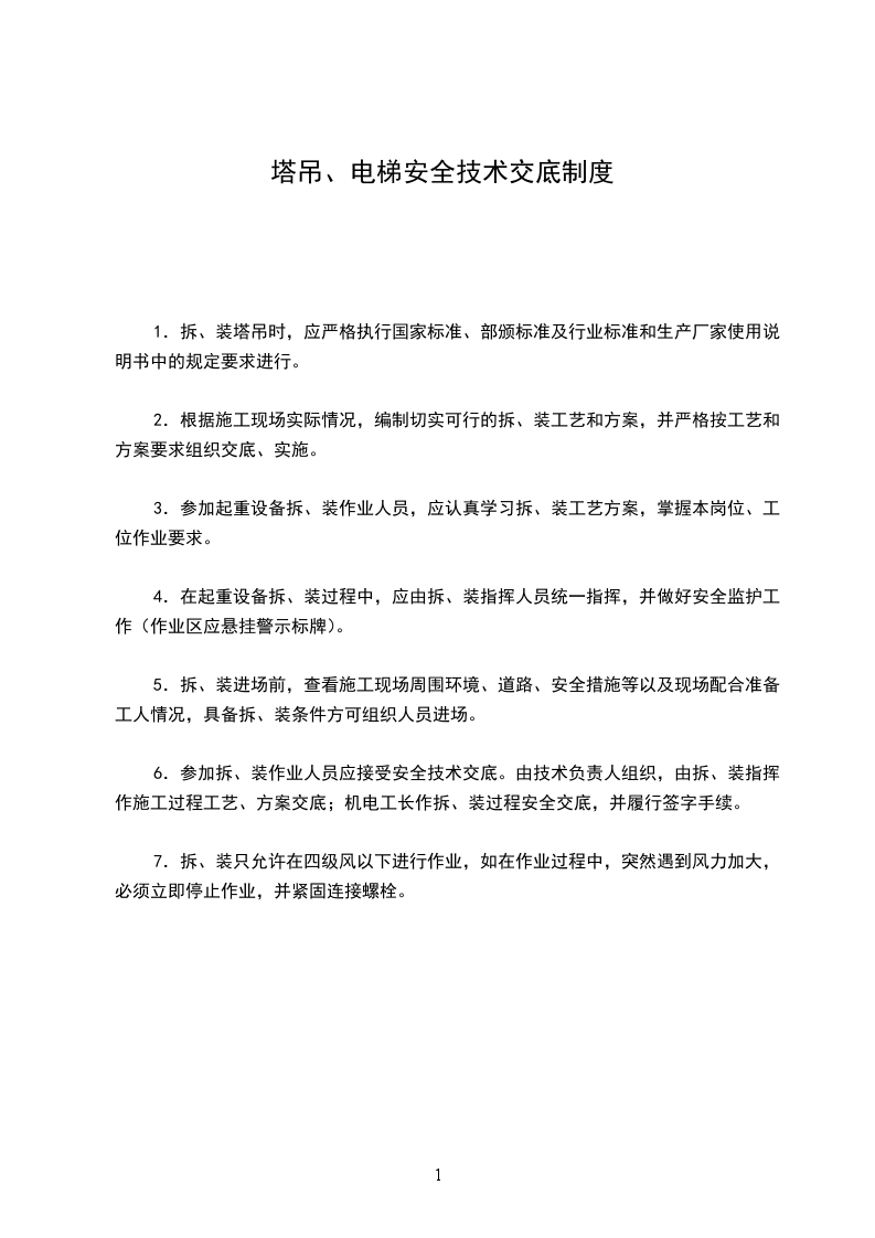 制度化和统一化作业行为,使人员管理工作有章可循,提高工作效率和责任感、归属感,特此编写。1.拆、装塔吊时,应严格执行国家标准、部颁标准及行业标准和生产厂家使用说明书中的规定要求进行。2.根据施工现场实际情况,编制切实可行的拆、装工艺和方案,并严格按工艺和方案要求组织交底、实施。3.参加起重设备拆、装作业人员,应认真学习拆、装工艺方案,掌握本岗位、工位作业要求。4.在起重设备拆、装过程中,应由拆、装指挥人员统一指挥,并做好安全监护工作(作业区应悬桂警示标牌)。5.拆、装进场前,查看施工现场周围环境、道路、安全措施等以及现场配合准备工人情况,具备拆、装条件方可组织人员进场。6.参加拆、装作业人员应接受安全技术交底。由技术负责人组织,由拆、装指挥作施工过程工艺、方案交底;机电工长作拆、装过程安全交底,并履行签字手续。7.拆、装只允许在四级风以下进行作业,如在作业过程中,突然遇到风力加大,必须立即停止作业,并紧固连接螺栓。