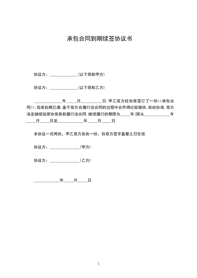 _____________年_____月__________日,甲乙双方经协商签订了一份<>,现承包期已满,鉴于双方在履行该合同的过程中合作得比较愉快,故经协商,双方决定继续按原协商条款履行该合同,继续履行的期限为_____年(即从_____________年_____月_____日至_____________年_____月_____日.