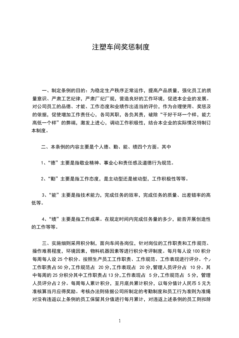 三、实施细则采用积分制,面向车间各岗位,针对岗位的工作职责和工作规范、操作难易程度,环境因素,物料机器因素等进行积分考评制度。每月每人设100积分,每周每人设25个积分。按照生产员工工作职责、工作规范、工作表现进行评分。个人工作职责占50分,工作规范占20分,工作表现占20分,管理人员评分占10分。其中每周的25分积分其中工作职责占13分,工作表现占5分,工作规范占5分,管理人员评分占2分。每周每人累计积分,至月底共累计积分,以每分值计人民币5元为准核算当月应得奖励。考核办法则依据公司所制定的考勤制度和员工行为准则为准绳,对没有违返以上条例的员工保留其分值进行每月累计,对违返上述条例的员工则扣除相应的分值后再进行累计。以每三个月为一个计分周期,在一个计分周期内的平均积分最后的二名员工将不会得到公司的奖励,连续四个计分周期都在前二名的员工将会得到公司的额外奖励。奖励发放时间:在一个计分周期结束后当月工资发放时同时发放奖励。