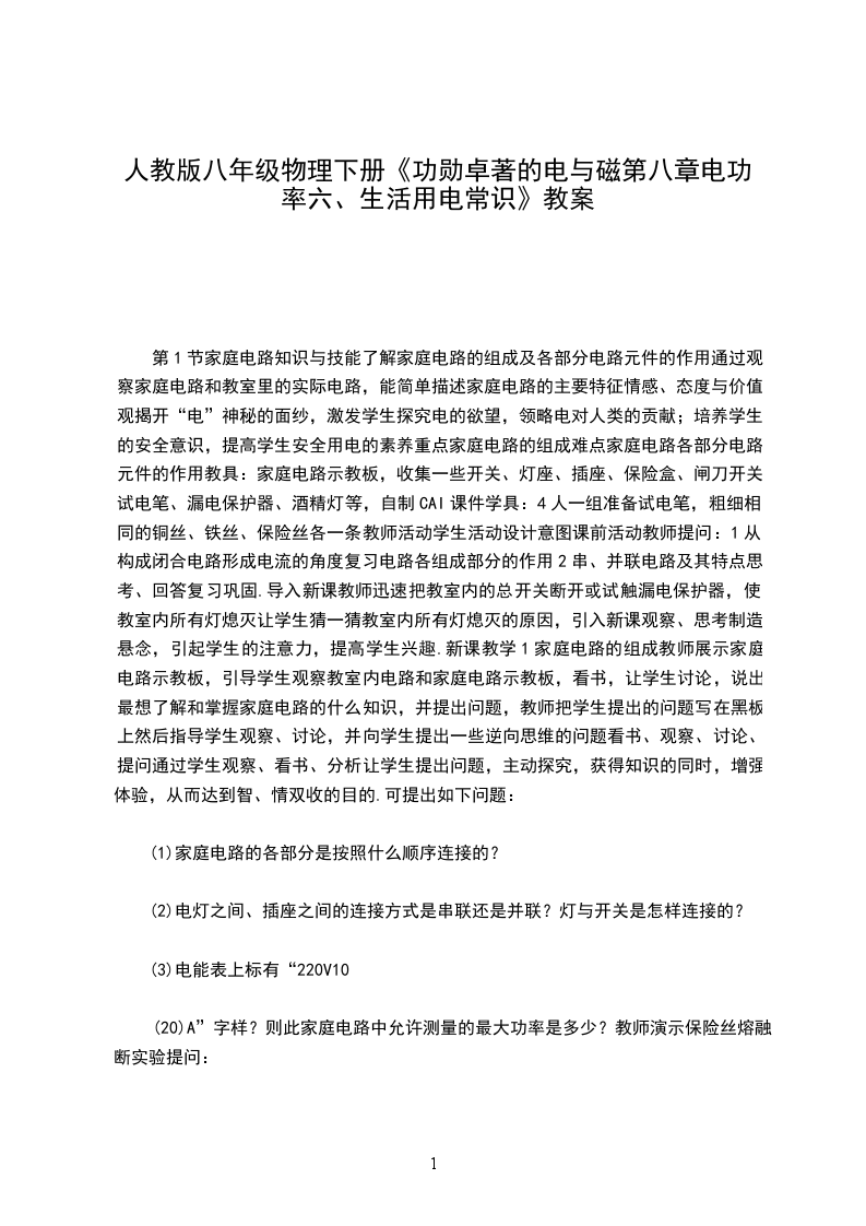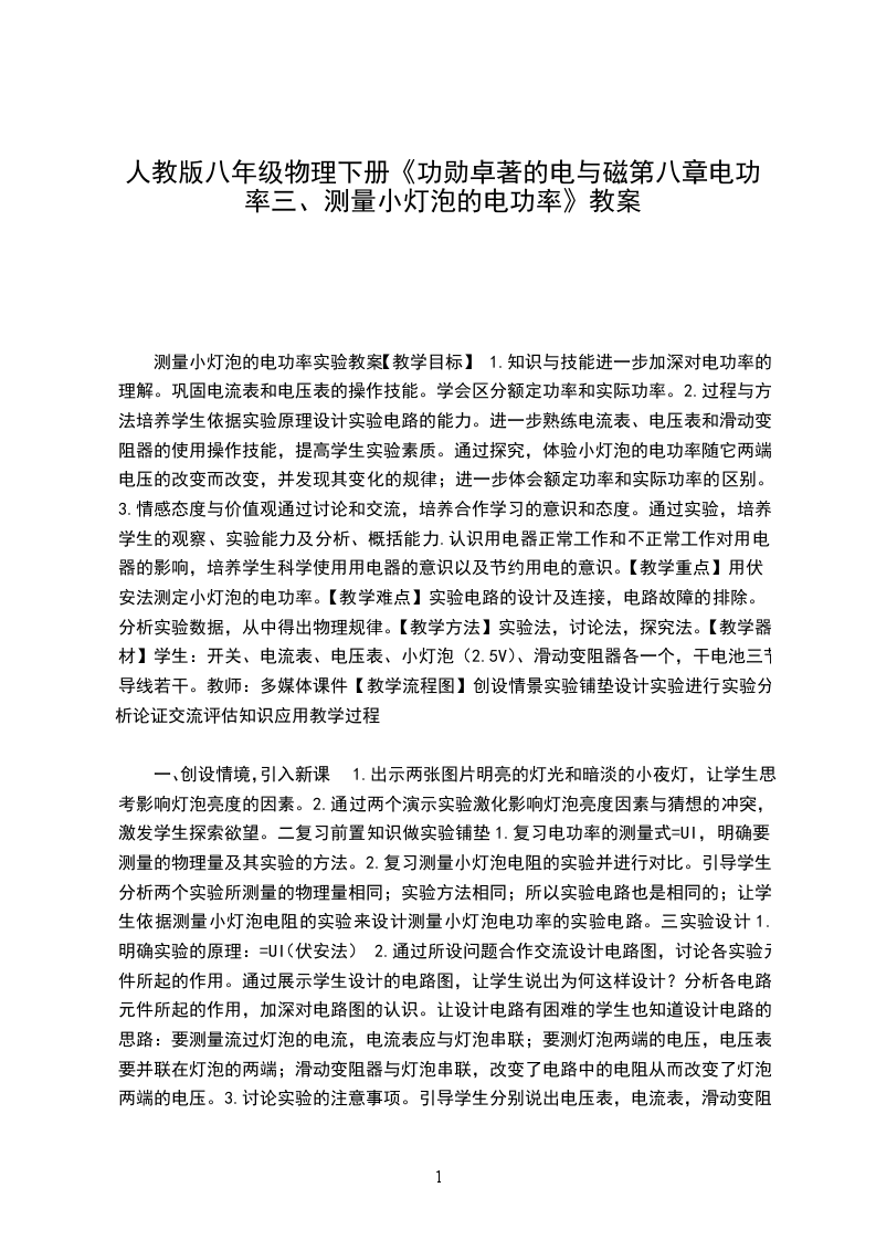 电生磁(复习)教案教材分析:本节课复习内容包括北师大版九年级物理的电流的磁场、电磁铁及其应用、磁场对通电导线的作用力、直流电动机四节内容。其中第四节是第三节有关知识的应用。教学目标1.通过复习明确这一章的知识框架。2.通过复习让学生掌握考纲上相关内容提出的要求。教学重点:整章知识点的总结教学难点:通过三幅图片的讨论让学生弄懂电流的磁场、电磁铁、磁场对电流的作用以及学生喜欢搞混淆的电磁感应现象的内涵。教学准备:课件教学过程1.总结整章知识框架,让学生明确本节课要复习的电生磁与整章知识的关系。2.让学生齐读与本章内容有关的考纲。让学生明白这节课要复习的电生磁包括三个部分:电流的磁场、电磁铁及其应用、磁场对电流的作用。并把班上的学生分为三组:第一组同学代表电流的磁场、第二组同学代表电磁铁及其应用、第三组同学代表磁场对电流的作用。3.三个小组的同学分别回答t上各自的问题。这些问题都比较基础。回答错误的扣掉本组5分。4.针对书上的三幅图片让学生讨论t上呈现的几个问题。5.学生回答问题,教师总结电生磁和磁生电的区别、能量的转化、怎样判断磁极或受力方向以及应用。6.教师呈现题目,学生抢答,答对加10分,答错扣5分。7.总结各组的得分,引导学生总结本节课的收获。教学反思本节课中我觉得自己的不足就是语言方面功夫不足,不是很有感染力,这也是我以后要努力的一个方面。指导老师点评1.本节课注重了知识网络的形成,考纲的要求,让学生目的明确。2.本节课注重了分层教学,有基础内容,也有提高的部分。3.本节课以加分的形式,提高了趣味性和学生的积极性。4.本节课有学生的讨论,点名回答问题和抢答,增加了学生的参与度。9年级物理张X20__年4月9日