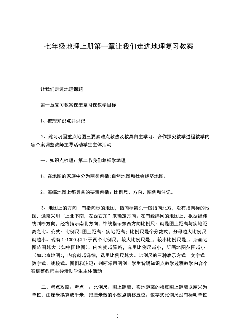 3、地图上的方向:有指向标的地图,指向标箭头一般指向北方;没有指向标的地图,通常采用“上北下南,左西右东”来确定方向。在有经纬网的地图上,根据经纬线判断方向,经线指示南北方向,纬线指示东西方向比例尺:就是图上距离与实地距离之比。公式:比例尺=图上距离:实地距离;比例尺是个分数式,分母越大比例尺就越小。现有1:1000和1:于两个比例尺,较大比例尺是_,较小比例尺是_。所画地图范围越大(如中国地图),内容就越简略,选用比例尺越小,所画地图范围越小(如北京地图),内容就越详细,选用比例尺越大。比例尺的三种表示方式:文字式、数字式、线段式。图例和注记:判断常用图例:学生背诵知识点教学过程教学内容个案调整教师主导活动学生主体活动