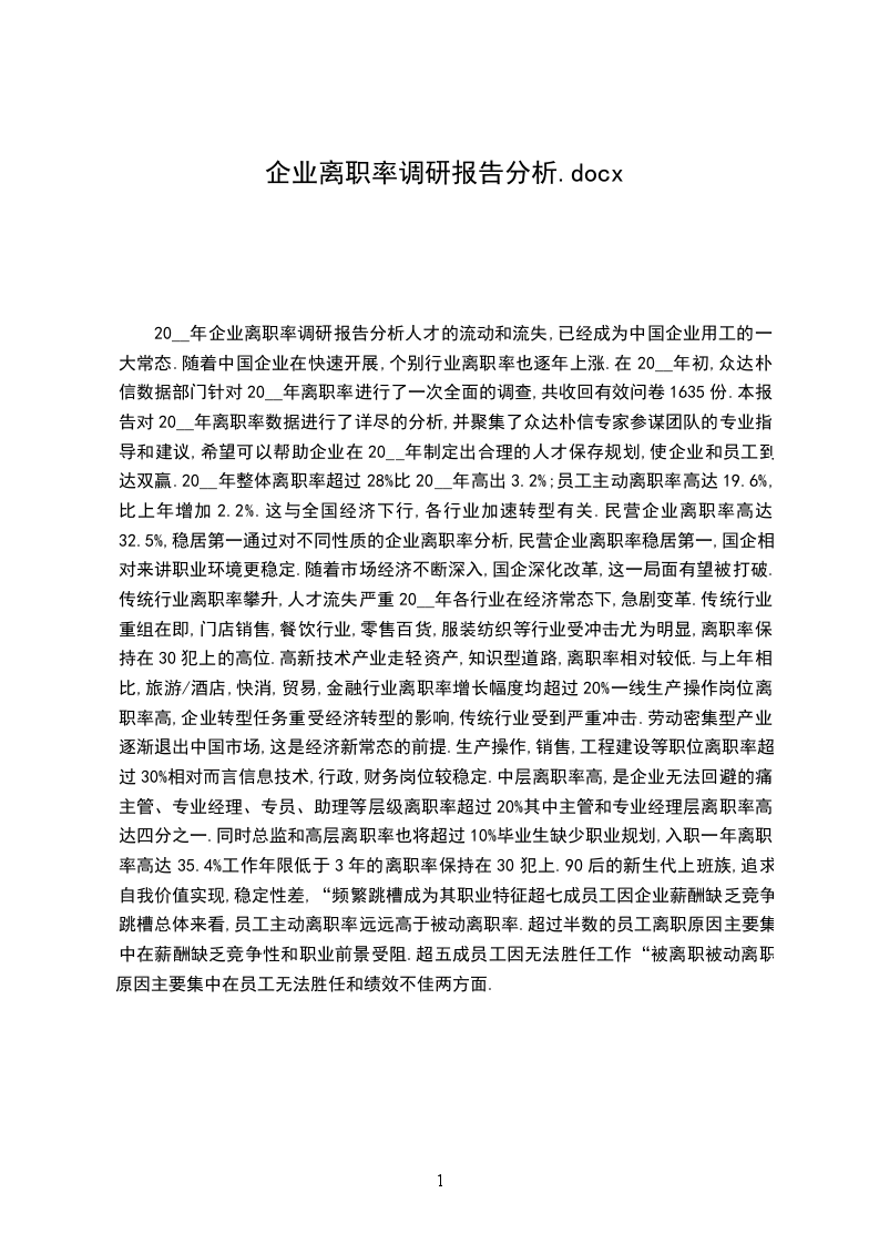 20__年企业离职率调研报告分析人才的流动和流失,已经成为中国企业用工的一大常态.随着中国企业在快速开展,个别行业离职率也逐年上涨.在20__年初,众达朴信数据部门针对20__年离职率进行了一次全面的调查,共收回有效问卷1635份.本报告对20__年离职率数据进行了详尽的分析,并聚集了众达朴信专家参谋团队的专业指导和建议,希望可以帮助企业在20__年制定出合理的人才保存规划,使企业和员工到达双赢.20__年整体离职率超过28%比20__年高出3.2%;员工主动离职率高达19.6%,比上年增加2.2%.这与全国经济下行,各行业加速转型有关.民营企业离职率高达32.5%,稳居第一通过对不同性质的企业离职率分析,民营企业离职率稳居第一,国企相对来讲职业环境更稳定.随着市场经济不断深入,国企深化改革,这一局面有望被打破.传统行业离职率攀升,人才流失严重20__年各行业在经济常态下,急剧变革.传统行业重组在即,门店销售,餐饮行业,零售百货,服装纺织等行业受冲击尤为明显,离职率保持在30犯上的高位.高新技术产业走轻资产,知识型道路,离职率相对较低.与上年相比,旅游/酒店,快消,贸易,金融行业离职率增长幅度均超过20%一线生产操作岗位离职率高,企业转型任务重受经济转型的影响,传统行业受到严重冲击.劳动密集型产业逐渐退出中国市场,这是经济新常态的前提.生产操作,销售,工程建设等职位离职率超过30%相对而言信息技术,行政,财务岗位较稳定.中层离职率高,是企业无法回避的痛主管、专业经理、专员、助理等层级离职率超过20%其中主管和专业经理层离职率高达四分之一.同时总监和高层离职率也将超过10%毕业生缺少职业规划,入职一年离职率高达35.4%工作年限低于3年的离职率保持在30犯上.90后的新生代上班族,追求自我价值实现,稳定性差,“频繁跳槽成为其职业特征超七成员工因企业薪酬缺乏竞争跳槽总体来看,员工主动离职率远远高于被动离职率.超过半数的员工离职原因主要集中在薪酬缺乏竞争性和职业前景受阻.超五成员工因无法胜任工作“被离职被动离职原因主要集中在员工无法胜任和绩效不佳两方面.