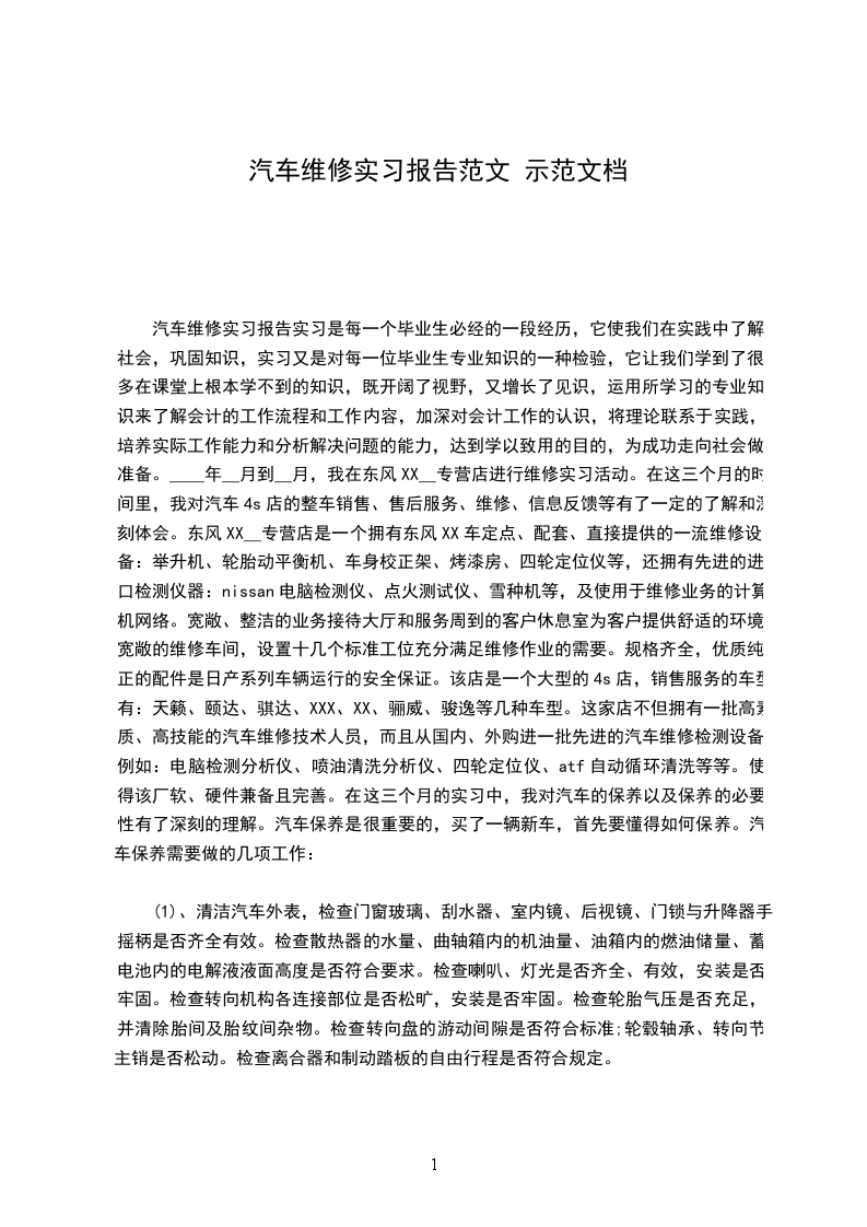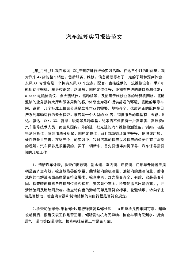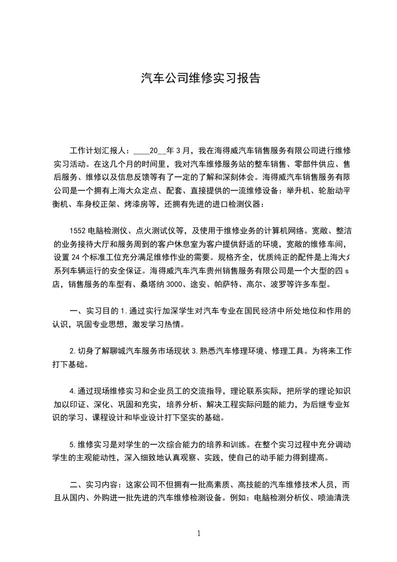 工作计划汇报人:____20__年3月,我在海得威汽车销售服务有限公司进行维修实习活动。在这几个月的时间里,我对汽车维修服务站的整车销售、零部件供应、售后服务、维修以及信息反馈等有了一定的了解和深刻体会。海得威汽车销售服务有限公司是一个拥有上海大众定点、配套、直接提供的一流维修设备:举升机、轮胎动平衡机、车身校正架、烤漆房等,还拥有先进的进口检测仪器: