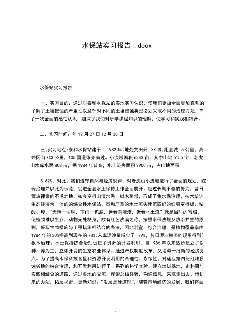 一、实习目的:通过对泰和水保站的实地实习认识,使我们更加全面更加直观的了解了土壤侵蚀的严重性以及针对不同的土壤侵蚀类型必须采取不同的治理方法,有了一次全面的感性认识,加深了我们对所学课程知识的理解,使学习和实践相结合。