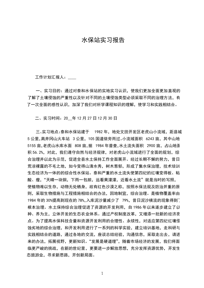 三、实习地点:泰和水保站建于1982年,地处文田开发区老虎山小流域,距县城5公里,离井冈山火车站3公里,105国道依旁而过。小流域面积6243亩,其中山地5155亩,老虎山水库水面808亩,据1984年普查,水土流失面积2900亩,占山地面积56.2%,对此,我们遵守自然与经济规律,对老虎山小流域进行了全面的规划,综合治理并以此为示范,促进全县水土保持工作全面展开。经过长期不懈的努力,昔日荒凉裸露的不毛之地,如今变得山清水秀,树木葱郁,形成了集水保治理,技术培训,生态经济为一体的的综合性水保站。泰和严重的水土流失使第四纪的红壤变得板、粘、酸、瘦,“天晴一块铜,下雨一包脓,远看黄濛濛,近看水土流”就是当时的写照,使植物难以生存,动物无处栖身,故有红色沙漠之称,按照水保法规及防治并重的原则,采取生物措施与工程措施相结合的办法,因地制宜,综合治理。是植物覆盖率由1984年的30%提高到现在的78%,入库泥沙量减少了79%,昔日泥沙横流的现象得到了根本治理。水土保持综合治理促进了资源的开发利用,自1986年以来逐步建立了以种、养为主,立体开发的生态农业体系。通过产权制度改革,又增添一批新的经济亮点。为了提高水保科技含量和资源开发利用的合理性、永续性,对适应第四纪红壤侵蚀劣地的综合治理,和开发利用进行了一系列的科学实验,建立培训基地,走科研与实践相结合的道路,通过各地的交流,座谈总结经验,沟通信息,采取走出去,请进来的办法,拓展视野,更新知识。“发展是硬道理”,随着市场经济的发展,我们将面临更严峻的挑战,在新的世纪里,更要进一步解放思想,充分发挥资源优势,开发生态旅游业,寻求新思路,开创新局面。