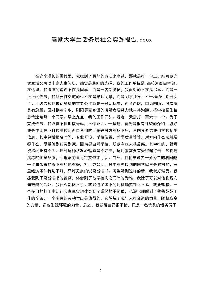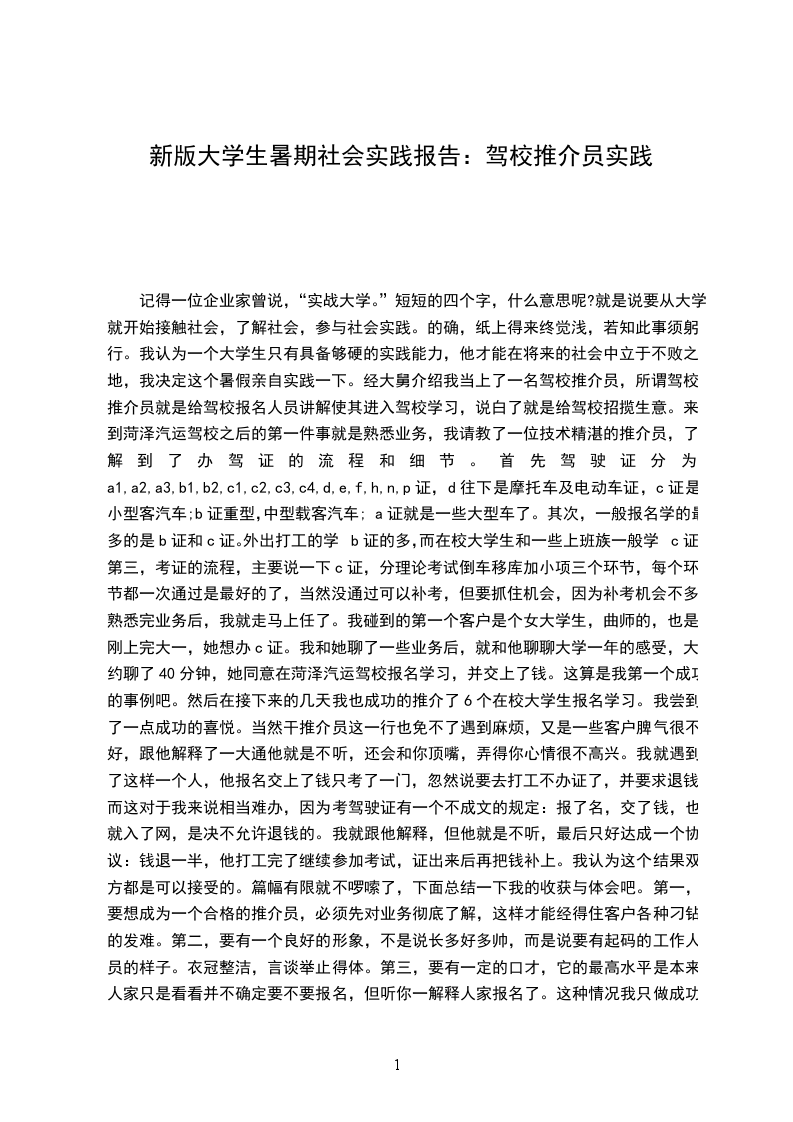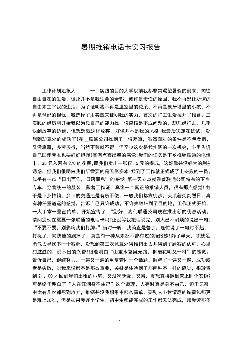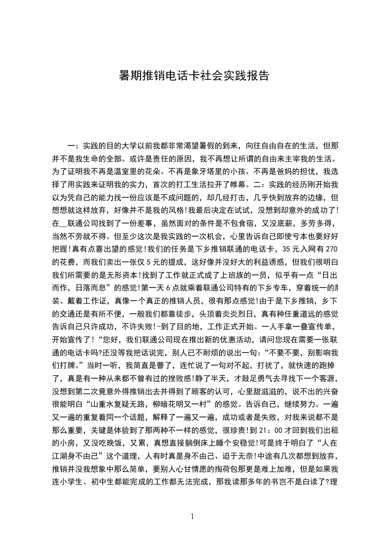 一:实践的目的大学以前我都非常渴望暑假的到来,向往自由自在的生活,但那并不是我生命的全部。或许是责任的原因,我不再想让所谓的自由来主宰我的生活。为了证明我不再是温室里的花朵、不再是象牙塔里的小孩、不再是爸妈的担忧,我选择了用实践来证明我的实力,首次的打工生活拉开了帷幕。二:实践的经历刚开始我以为凭自己的能力找一份应该是不成问题的,却几经打击,几乎快到放弃的边缘,但想想就这样放弃,好像并不是我的风格!我最后决定在试试,没想到却意外的成功了!在__联通公司找到了一份差事,虽然面对的条件是不包食宿,又没底薪,多劳多得,当然不劳就不得。但至少这次是我实践的一次机会,心里告诉自己即使亏本也要好好把握!真有点喜出望的感觉!我们的任务是下乡推销联通的电话卡,35元入网有270的花费,而我们卖出一张仅5元的提成,这好像并没好大的利益诱惑,但我们很明白我们所需要的是无形资本!找到了工作就正式成了上班族的一员,似乎有一点“日出而作,日落而息”的感觉!第一天6点就乘着联通公司特有的下乡专车,穿着统一的服装、戴着工作证,真像一个真正的推销人员,很有那点感觉!由于是下乡推销,乡下的交通还是有所不便,一般我们都靠徒步,头顶着炎炎烈日,真有种任重道远的感觉,告诉自己只许成功,不许失败!-到了目的地,工作正式开始。一人手拿一叠宣传单,开始宣传了!“您好,我们联通公司现在推出新的优惠活动,请问您现在需要一张联通的电话卡吗?还没等我把话说完,别人已不耐烦的说出一句:“不要不要,别影响我们打牌。”当时一听,我简直是瞢了,连忙说了一句对不起,打扰了,就快速的跑掉了,真是有一种从来都不曾有过的挫败感!静了半天,才鼓足勇气去寻找下一个客源,没想到第二次竟意外得推销出去并得到了顾客的认可,心里甜滋滋的,说不出的兴奋!很能明白“山重水复疑无路,柳暗花明又一村”的感觉。告诉自己,继续努力。一遍又一遍的重复着同一个话题,解释了一遍又一遍,成功或者是失败,对我来说都不是那么重要,关键是体验到了那两种不一样的感觉,很珍贵!到21:00才回到我们出租的小房,又没吃晚饭,又累,真想直接躺倒床上睡个安稳觉!可是终于明白了“人在江湖身不由己”这个道理,人有时真是身不由己、迫于无奈!中途有几次都想到放弃,推销并没我想象中那么简单,要别人心甘情愿的掏荷包那更是难上加难,但是如果我连小学生、初中生都能完成的工作都无法完成,那我读那多年的书岂不是白读了?理智告诉我必须坚持,我别无选择!每天的下乡活动,就是与太阳相拥、与老百姓亲密接触、与自己做斗争,说起来也没那么惨,做起来难那么一点点而已,只是万事开头难,过了那个磨合期,一切的一切就是自然与习惯了!工作了20天后,由于市场对电话卡已达到了饱和的状态,我也就辞职回家,享受我最后一个暑假生活了。