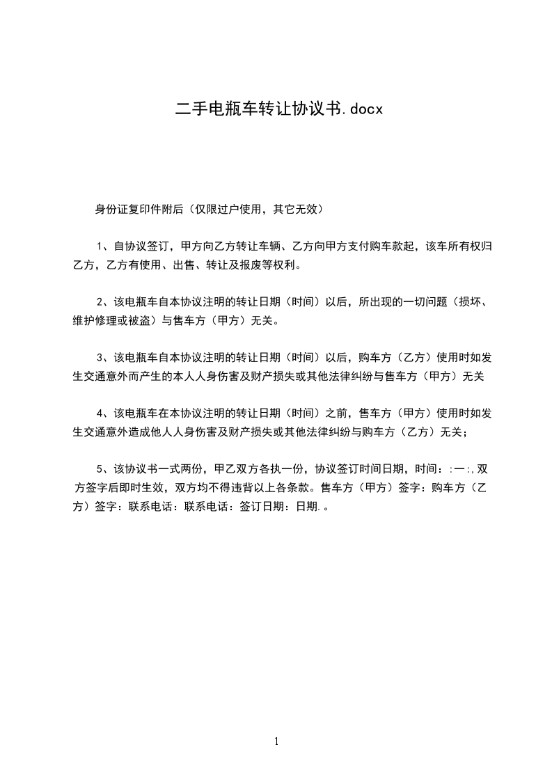 2、该电瓶车自本协议注明的转让日期(时间)以后,所出现的一切问题(损坏、维护修理或被盗)与售车方(甲方)无关。