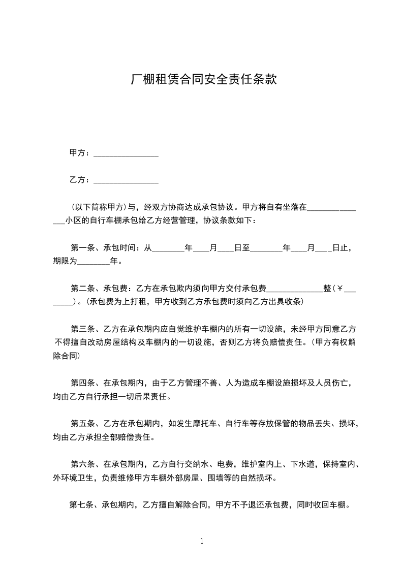 第四条、在承包期内,由于乙方管理不善、人为造成车棚设施损坏及人员伤亡,均由乙方自行承担一切后果责任。