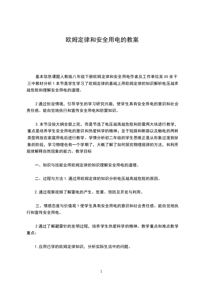 六、欧姆定律和安全用电教学目标:
