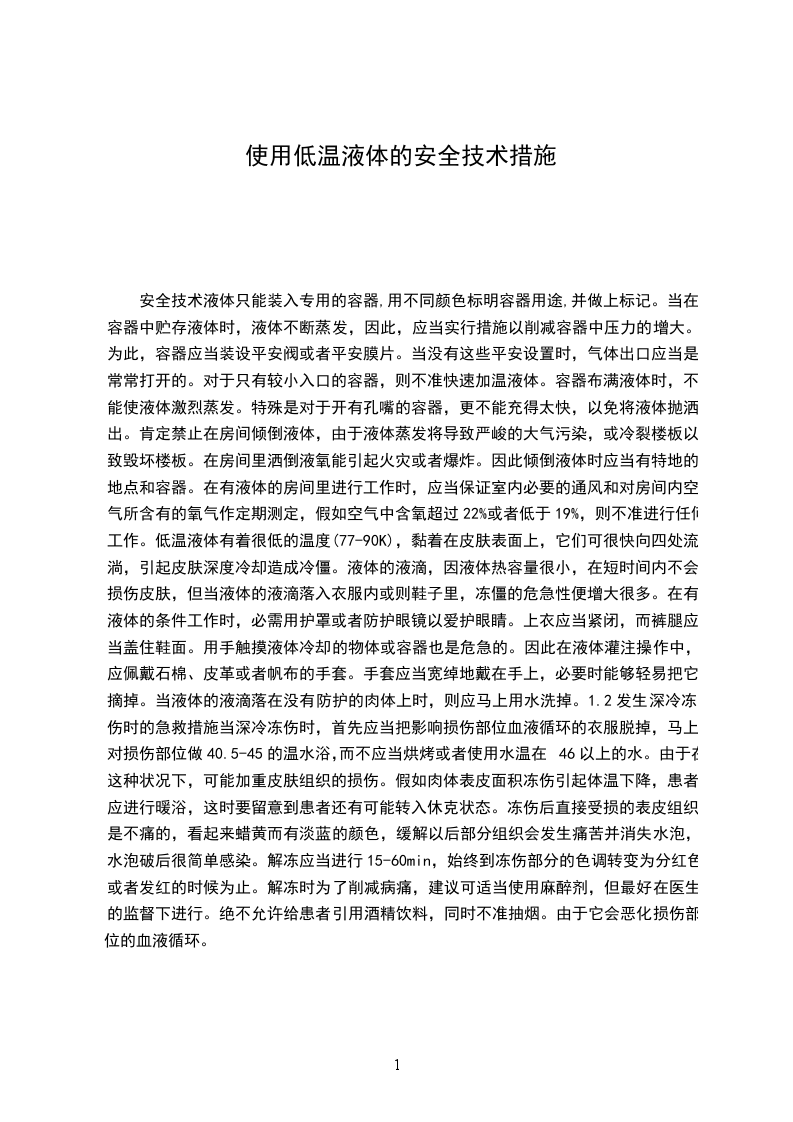 安全技术液体只能装入专用的容器,用不同颜色标明容器用途,并做上标记。当在容器中贮存液体时,液体不断蒸发,因此,应当实行措施以削减容器中压力的增大。为此,容器应当装设平安阀或者平安膜片。当没有这些平安设置时,气体出口应当是常常打开的。对于只有较小入口的容器,则不准快速加温液体。容器布满液体时,不能使液体激烈蒸发。特殊是对于开有孔嘴的容器,更不能充得太快,以免将液体抛洒出。肯定禁止在房间倾倒液体,由于液体蒸发将导致严峻的大气污染,或冷裂楼板以致毁坏楼板。在房间里洒倒液氧能引起火灾或者爆炸。因此倾倒液体时应当有特地的地点和容器。在有液体的房间里进行工作时,应当保证室内必要的通风和对房间内空气所含有的氧气作定期测定,假如空气中含氧超过22%或者低于19%,则不准进行任何工作。低温液体有着很低的温度(77-90K),黏着在皮肤表面上,它们可很快向四处流淌,引起皮肤深度冷却造成冷僵。液体的液滴,因液体热容量很小,在短时间内不会损伤皮肤,但当液体的液滴落入衣服内或则鞋子里,冻僵的危急性便增大很多。在有液体的条件工作时,必需用护罩或者防护眼镜以爱护眼睛。上衣应当紧闭,而裤腿应当盖住鞋面。用手触摸液体冷却的物体或容器也是危急的。因此在液体灌注操作中,应佩戴石棉、皮革或者帆布的手套。手套应当宽绰地戴在手上,必要时能够轻易把它摘掉。当液体的液滴落在没有防护的肉体上时,则应马上用水洗掉。1.2发生深冷冻伤时的急救措施当深冷冻伤时,首先应当把影响损伤部位血液循环的衣服脱掉,马上对损伤部位做40.5-45的温水浴,而不应当烘烤或者使用水温在46以上的水。由于在这种状况下,可能加重皮肤组织的损伤。假如肉体表皮面积冻伤引起体温下降,患者应进行暖浴,这时要留意到患者还有可能转入休克状态。冻伤后直接受损的表皮组织是不痛的,看起来蜡黄而有淡蓝的颜色,缓解以后部分组织会发生痛苦并消失水泡,水泡破后很简单感染。解冻应当进行15-60min,始终到冻伤部分的色调转变为分红色或者发红的时候为止。解冻时为了削减病痛,建议可适当使用麻醉剂,但最好在医生的监督下进行。绝不允许给患者引用酒精饮料,同时不准抽烟。由于它会恶化损伤部位的血液循环。