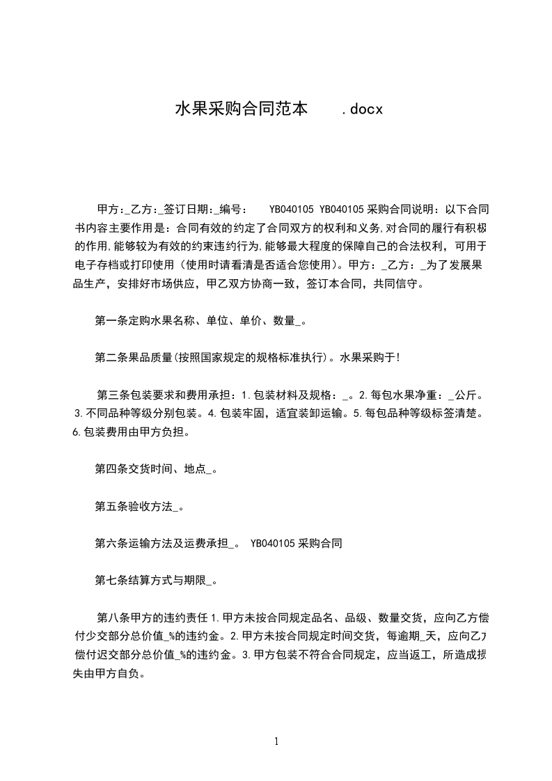 甲方:_乙方:_签订日期:_编号:YB040105 YB040105采购合同说明:以下合同书内容主要作用是:合同有效的约定了合同双方的权利和义务,对合同的履行有积极的作用,能够较为有效的约束违约行为,能够最大程度的保障自己的合法权利,可用于电子存档或打印使用(使用时请看清是否适合您使用)。甲方:_乙方:_为了发展果品生产,安排好市场供应,甲乙双方协商一致,签订本合同,共同信守。