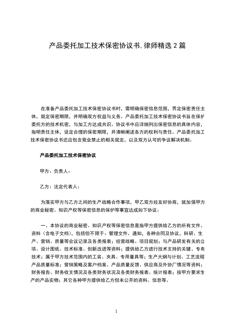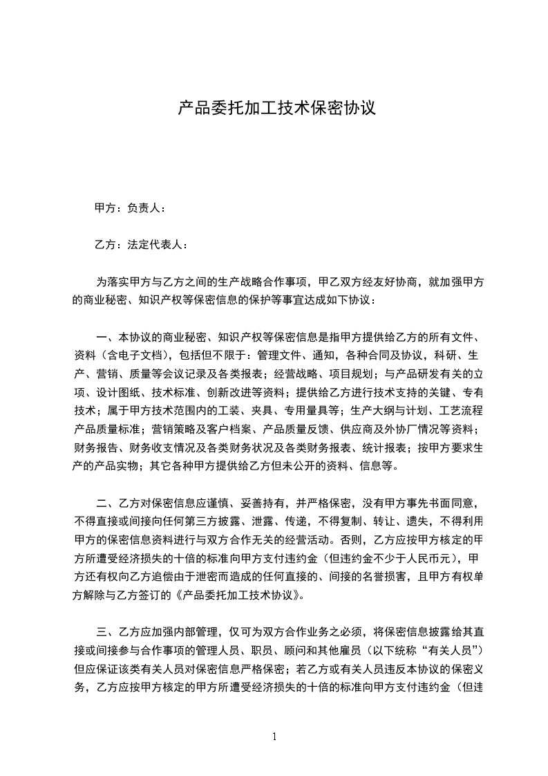 二、乙方对保密信息应谨慎、妥善持有,并严格保密,没有甲方事先书面同意,不得直接或间接向任何第三方披露、泄露、传递,不得复制、转让、遗失,不得利用甲方的保密信息资料进行与双方合作无关的经营活动。否则,乙方应按甲方核定的甲方所遭受经济损失的十倍的标准向甲方支付违约金(但违约金不少于人民币_____元),甲方还有权向乙方追偿由于泄密而造成的任何直接的、间接的名誉损害,且甲方有权单方解除与乙方签订的《产品委托加工技术协议》。