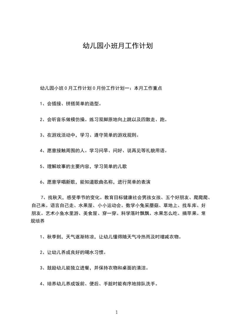 大部分幼儿都能够高兴来园,能较好的适应日常生活的作息时间及活动安排。大多数幼儿能大声能够向成人问好和再见,能随教师和同伴一起游戏。此时,应进一步加强对幼儿良好行为习惯的培养,如:幼儿洗手时,常对玩水、玩肥皂感兴趣,有时袖子会淋湿,还需要成人在游戏中进一步引导;部分幼儿独立进餐时还有困难,如端碗、用勺稳定性差,需要老师格外关心和帮助。本月工作计划制定如下: