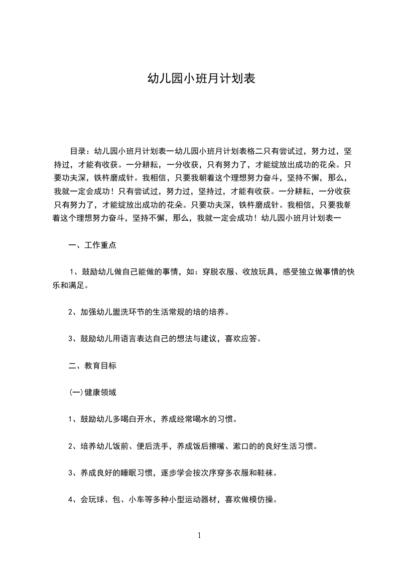 (一)健康领域、鼓励幼儿多喝白开水,养成经常喝水的习惯。、培养幼儿饭前、便后洗手,养成饭后擦嘴、漱口的的良好生活习惯。、养成良好的睡眠习惯,逐步学会按次序穿多衣服和鞋袜。、会玩球、包、小车等多种小型运动器材,喜欢做模仿操。