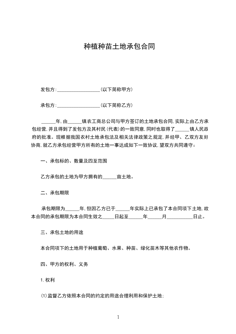 1.承包年限为__________年。自__________年__________月__________日起至__________年__________月__________日止。