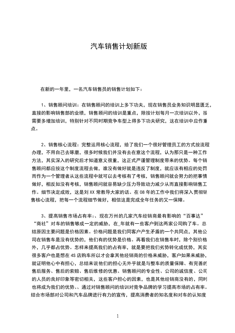 3、提高销售市场占有率:、现在万州的几家汽车经销商最有影响的“百事达”“商社”对车的销售够成一定的威胁,在_年就有一些客户到这两家公司购了车。总结原因主要问题是价格因素。价格问题是我们同客户产生矛盾的一个共同点,其他公司在销售车是没有优势的,他们有的优势是价格。再看我们在销售车时,除个别价格外,几乎都占优势。怎样来提高我们的占有率,就是要把我们劣势转化成优势,其实很多客户也是想在4S店购车所以才会拿其他经销商的价格来威胁,客户如果来威胁,就证明他心中有担心,总结来说他们的担心无外乎就是与整车的质量保障、有完善的售后服务、售后的索赔、售后维修的优惠、销售顾问的专业性、公司的诚信度、公司的人员的良好印象等密切相关,这些客户担心的因素,也是其他经销商没有的,同时也将成为我们的优势。、通过对销售顾问的培训对竞争品牌的学习提高市场的占有率。、结合市场部对公司和汽车品牌进行有力的宣传,提高消费者的知名度和对车的认知度。