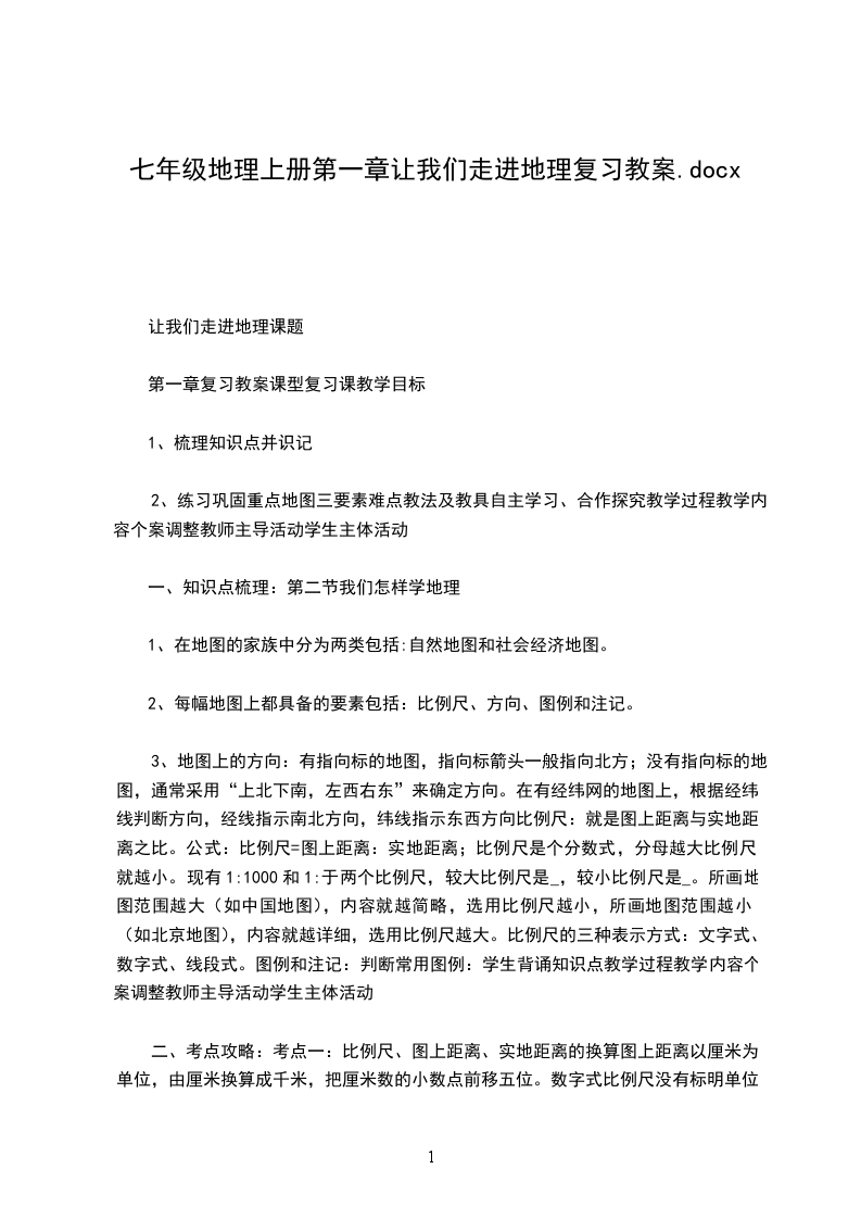 3、地图上的方向:有指向标的地图,指向标箭头一般指向北方;没有指向标的地图,通常采用“上北下南,左西右东”来确定方向。在有经纬网的地图上,根据经纬线判断方向,经线指示南北方向,纬线指示东西方向比例尺:就是图上距离与实地距离之比。公式:比例尺=图上距离:实地距离;比例尺是个分数式,分母越大比例尺就越小。现有1:1000和1:于两个比例尺,较大比例尺是_,较小比例尺是_。所画地图范围越大(如中国地图),内容就越简略,选用比例尺越小,所画地图范围越小(如北京地图),内容就越详细,选用比例尺越大。比例尺的三种表示方式:文字式、数字式、线段式。图例和注记:判断常用图例:学生背诵知识点教学过程教学内容个案调整教师主导活动学生主体活动