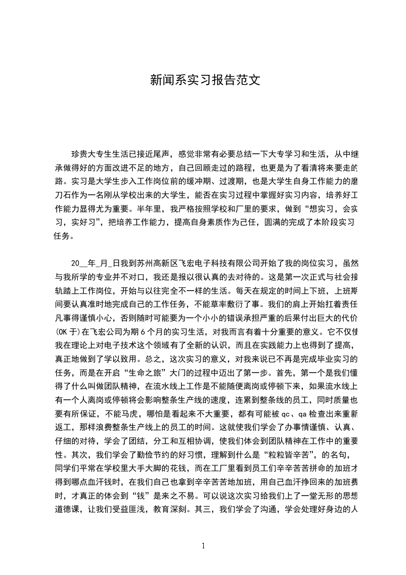 20__年_月_日我到苏州高新区飞宏电子科技有限公司开始了我的岗位实习,虽然与我所学的专业并不对口,我还是报以很认真的去对待的。这是第一次正式与社会接轨踏上工作岗位,开始与以往完全不一样的生活。每天在规定的时间上下班,上班期间要认真准时地完成自己的工作任务,不能草率敷衍了事。我们的肩上开始扛着责任,凡事得谨慎小心,否则随时可能要为一个小小的错误承担严重的后果付出巨大的代价。(OK于)在飞宏公司为期6个月的实习生活,对我而言有着十分重要的意义。它不仅使我在理论上对电子技术这个领域有了全新的认识,而且在实践能力上也得到了提高,真正地做到了学以致用。总之,这次实习的意义,对我来说已不再是完成毕业实习的任务,而是在开启“生命之旅”大门的过程中迈出了第一步。首先,第一个是我们懂得了什么叫做团队精神,在流水线上工作是不能随便离岗或停顿下来,如果流水线上有一个人离岗或停顿将会影响整条生产线的速度,连累到整条线的员工,同时质量也要有所保证,不能马虎,哪怕是看起来不大重要,都有可能被qc、qa检查出来重新返工,那样浪费整条生产线上的员工的时间。这就使我们学会了办事情谨慎、认真、仔细的对待,学会了团结,分工和互相协调,使我们体会到团队精神在工作中的重要性。其次,我们学会了勤俭节约的好习惯,理解到什么是“粒粒皆辛苦”,的名句,同学们平常在学校里大手大脚的花钱,而在工厂里看到员工们辛辛苦苦拼命的加班才得到哪点血汗钱时,在我们自己也拿到辛辛苦苦地加班,用自己血汗挣回来的加班费时,才真正的体会到“钱”是来之不易。可以说这次实习给我们上了一堂无形的思想道德课,让我们受益匪浅,教育深刻。其三,我们学会了沟通,学会处理好身边的人际关系,学会在苦中作乐的技巧,在生产线上工作是比较枯燥的,每天都反复的做那份工作,如果没有同身边的同事沟通,处理好身边的人际关系,一个人是很孤独,同时在一个工位上工作时间长了,前后工位之间将免不了有磨擦出现,处理不好,将影响我们的工作质量。这就让我们懂得了人际关系的重要性,一个好的人缘将会给我们的工作带来了无限的方便和欢乐。其四,我们在工作中学会了研究。在工作中,方法中的正确和方便性非常重要,直接影响到生产的效率,我们在自己的岗位上做熟了对自己所做的工作也仔细研究起来,细心分析其方法,模具的缺点,自己研制出一套更加便捷简单的方法来提高自己的速度和减少工作量,真正充分体现出大学生的不同之处,体现了大学生的风采。总的来说,我们这一次实习学习到了很多在校园、在课堂上、课本上学不到的东西,也使同学们了解很多和懂得了做人的道理,特别是体会到生活中的艰辛和找工作的不容易。在此,我要感谢所有为我的实习提供帮助和领导老师们,感谢你们这么多天的照顾和帮助。相信这次珍贵的实习经历会一直伴随着我以后的工作生活。千里之行,始于足下,我会通过这次实习,更加懂得知识和实践的积累,不断充实自己。