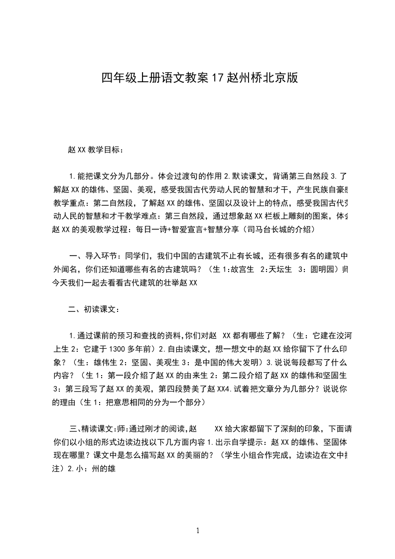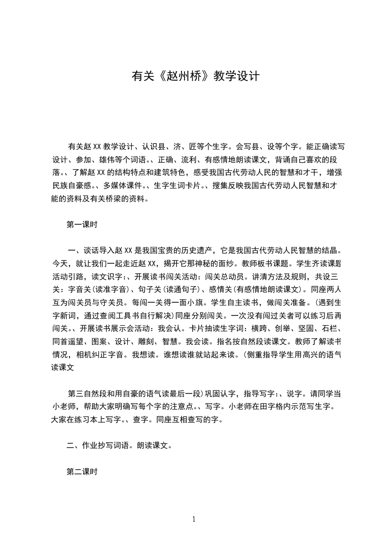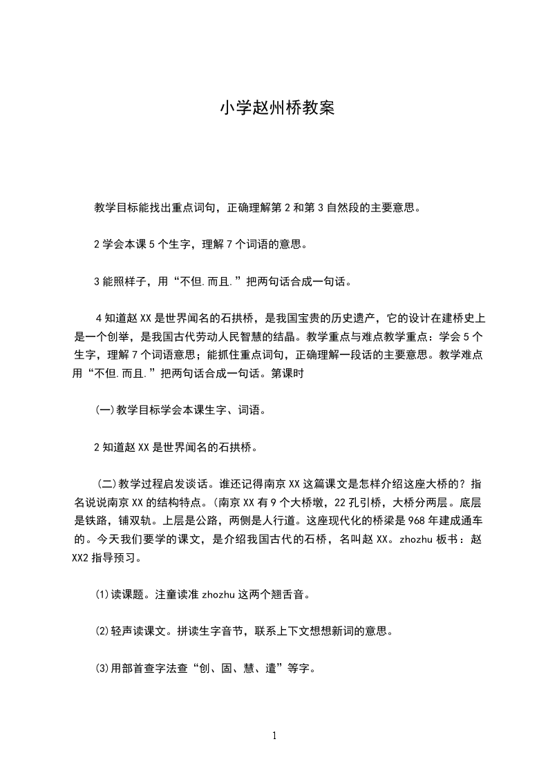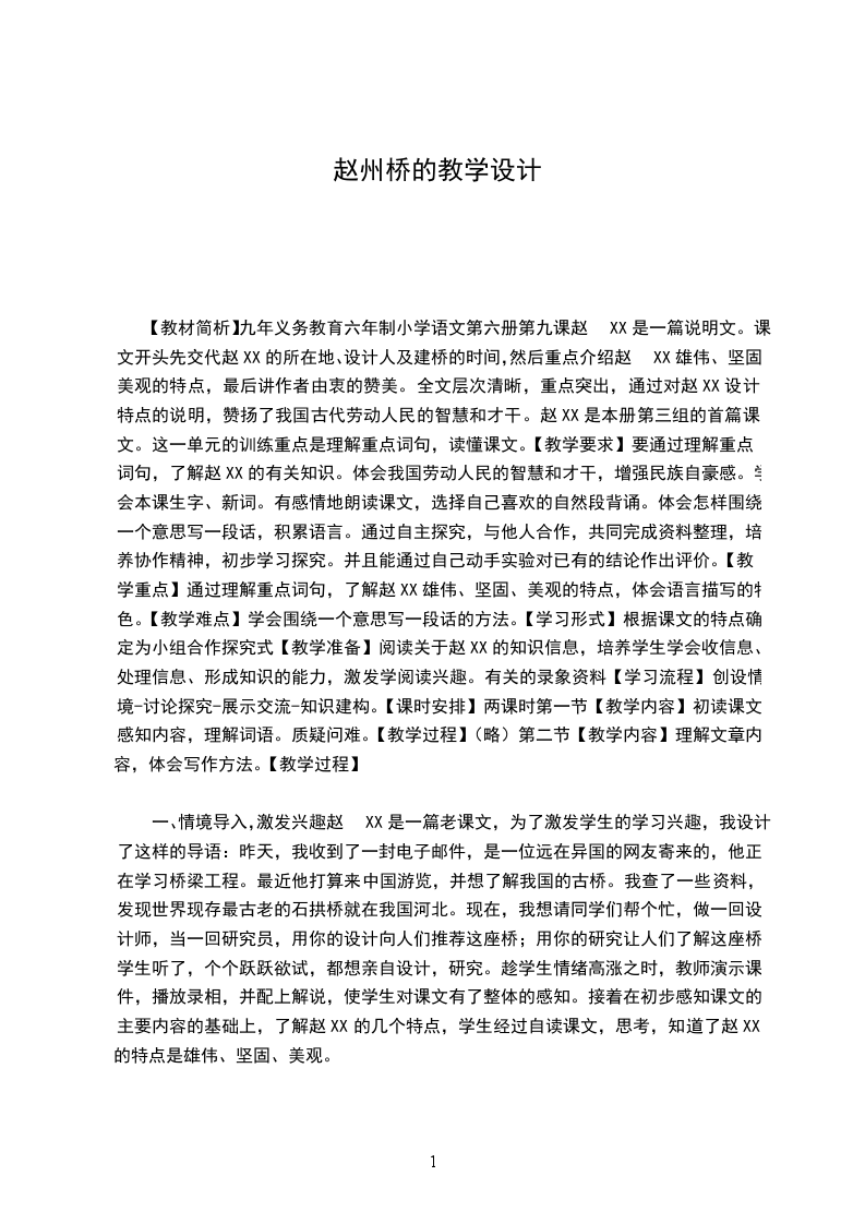 三、精读课文:师:通过刚才的阅读,赵XX给大家都留下了深刻的印象,下面请你们以小组的形式边读边找以下几方面内容1.出示自学提示:赵XX的雄伟、坚固体现在哪里?课文中是怎么描写赵XX的美丽的?(学生小组合作完成,边读边在文中批注)2.小:州的雄