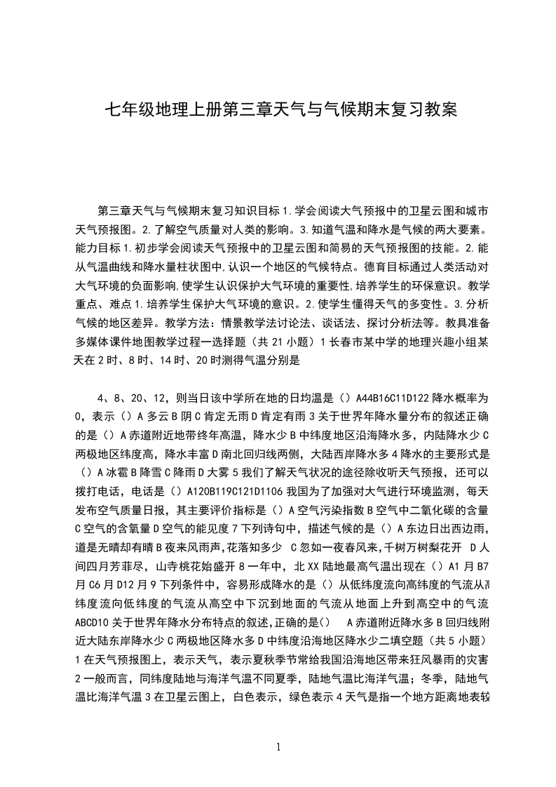 第三章天气与气候期末复习知识目标1.学会阅读大气预报中的卫星云图和城市天气预报图。2.了解空气质量对人类的影响。3.知道气温和降水是气候的两大要素。能力目标1.初步学会阅读天气预报中的卫星云图和简易的天气预报图的技能。2.能从气温曲线和降水量柱状图中,认识一个地区的气候特点。德育目标通过人类活动对大气环境的负面影响,使学生认识保护大气环境的重要性,培养学生的环保意识。教学重点、难点1.培养学生保护大气环境的意识。2.使学生懂得天气的多变性。3.分析气候的地区差异。教学方法:情景教学法讨论法、谈话法、探讨分析法等。教具准备多媒体课件地图教学过程一选择题(共21小题)1长春市某中学的地理兴趣小组某天在2时、8时、14时、20时测得气温分别是