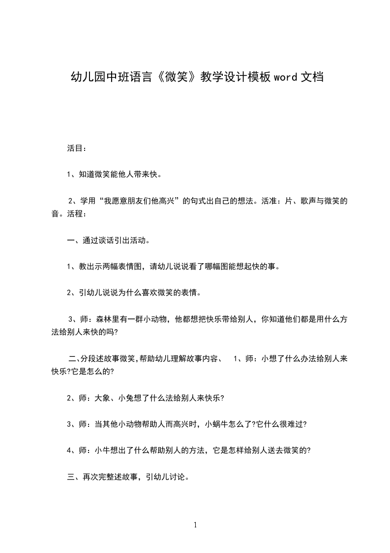 六、情感交流。你们觉得小蜗牛的微笑美吗?那小朋友也来笑一笑,看看自己的微笑美吗?小蜗牛把微笑送给了朋友们,你准备把你的微笑送给谁?为什么呢?那好,我们就来把微笑送给你想送给的人吧。(幼儿互相送微笑,活动自然结束)活动目标:
