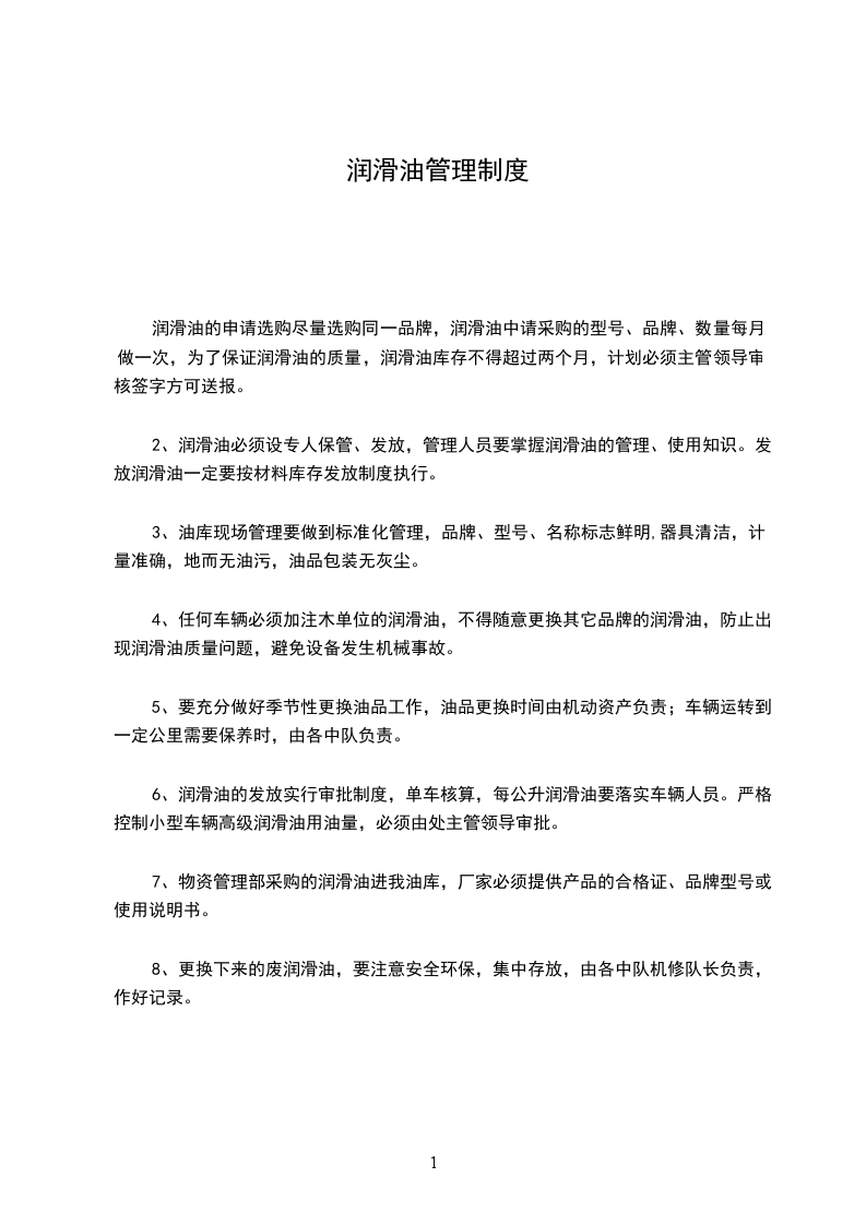 润滑油的申请选购尽量选购同一品牌,润滑油中请采购的型号、品牌、数量每月做一次,为了保证润滑油的质量,润滑油库存不得超过两个月,计划必须主管领导审核签字方可送报。