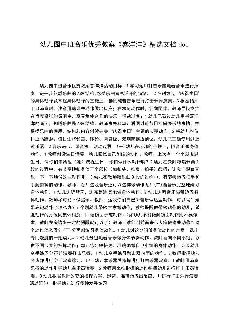 幼儿园中班音乐优秀教案喜洋洋活动目标:1.学习运用打击乐器随着音乐进行演奏,进一步熟悉乐曲的ABA结构,感受乐曲喜气洋洋的情绪。2.在创编过“庆祝生日”的身体动作及掌握身体动作的基础上,尝试随着音乐进行打击乐器演奏。3.根据指挥手势演奏时,注意迅速调整动作做出反应;在忘记动作时,能向同伴、教师寻找支持;在适度紧张的氛围中,享受集体合作的快乐。活动准备:1.幼儿已看过幼儿用书喜洋洋的画面,知道乐曲是ABA结构。教师事先和幼儿看图讨论节日期间快乐的事情,并根据乐曲的性质、结构和内容创编有关庆祝生日”主题的节奏动作。2.将幼儿座位排成马蹄形。值日生将铃鼓、碰铃、圆舞板、双响筒摆放到位。幼儿已正确使用过上述乐器。3.音乐磁带、录音机。活动过程:(-)幼儿在老师的带领下,随音乐做身体动作。1.教师创设生日情境,幼儿回忆自己创编的动作。教师:上次有一个小朋友过生日,请你们来给他(她)庆祝生日,你们做什么动作啊?2.幼儿在教师哼唱乐曲A段的过程中,有节奏地拍身体三个部位(如拍头、拍肩、拍手)教师:让我们跟着音乐一下一下地做这些动作吧!3.幼儿在教师唱乐曲B段的过程中,有节奏地做拍手和手腕颤抖的动作。教师:瞧!这段音乐还可以这样做动作呢!