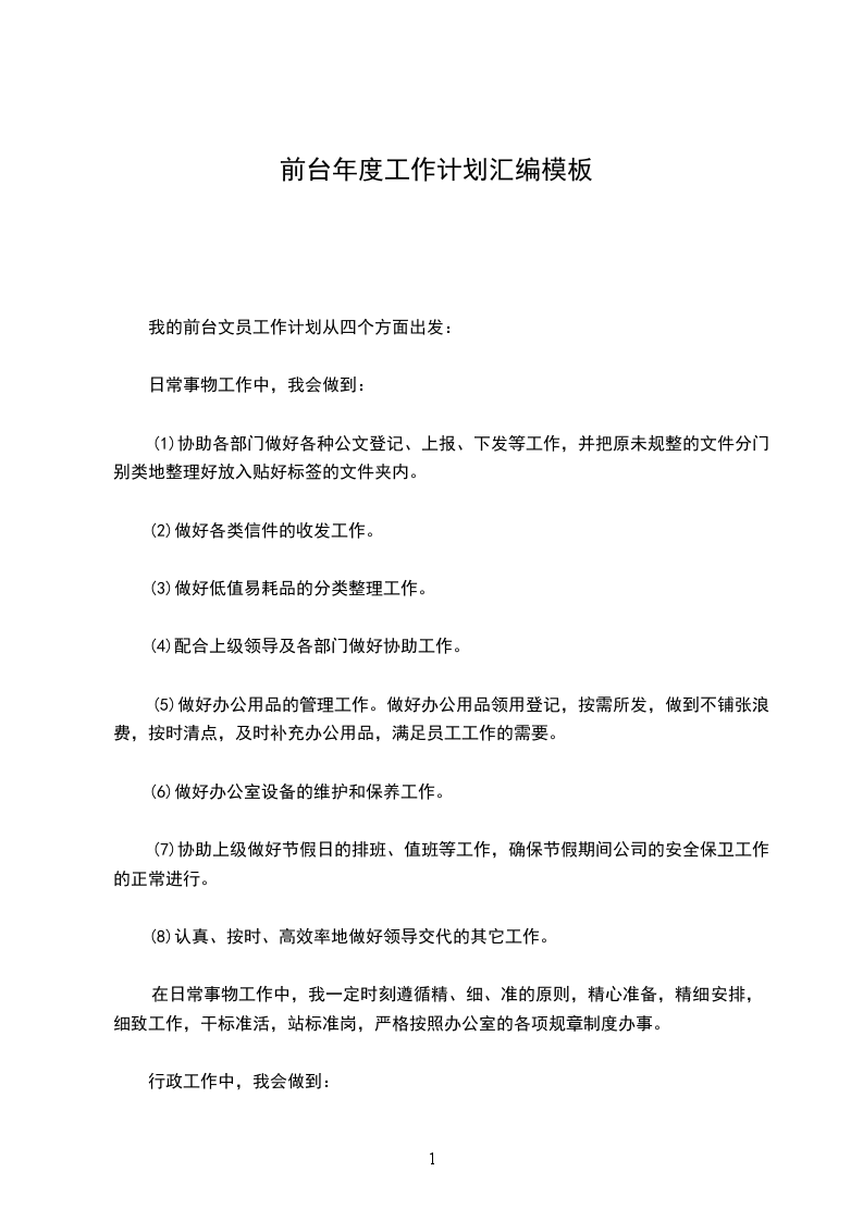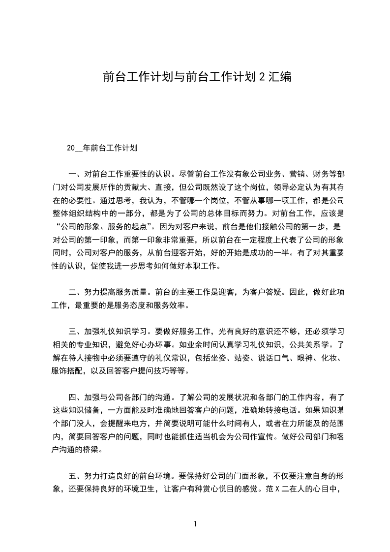 (2)完成领导安排的其它临时性工作。公司前台工作岗位是琐碎、繁杂的。我将视情况进行合理的分工、安排,实行岗位责任制,使工作井然有序的进行;还要创造性地进行工作,探索工作的新思路、新办法和新经验;工作执行上,我会注意办事到位而不越位,服务而不决策,真正的成为参谋助手,做好上、下沟通的桥梁。20__年前台工作计划在很多人的心目中,前台工作就是单纯的接下电话,制定一些表格等简单的工作而已,从我一年多的前台文员工作总结中得知,前台工作也是一项极为锻炼人,使人快速成长的工作,不信你看看我的前台工作计划中的内容便知了。我的个人工作计划范文中从四个方面出发:1在日常事物工作中,我将做到以下几点: