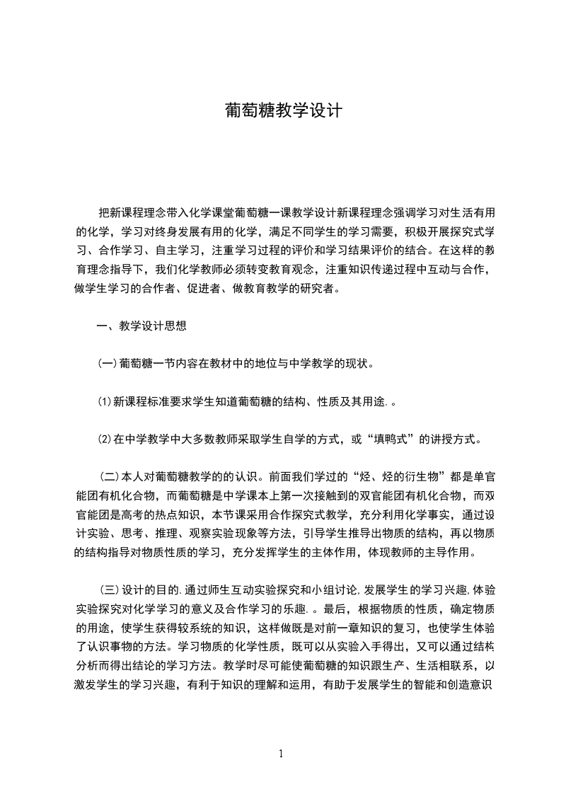 把新课程理念带入化学课堂葡萄糖一课教学设计新课程理念强调学习对生活有用的化学,学习对终身发展有用的化学,满足不同学生的学习需要,积极开展探究式学习、合作学习、自主学习,注重学习过程的评价和学习结果评价的结合。在这样的教育理念指导下,我们化学教师必须转变教育观念,注重知识传递过程中互动与合作,做学生学习的合作者、促进者、做教育教学的研究者。