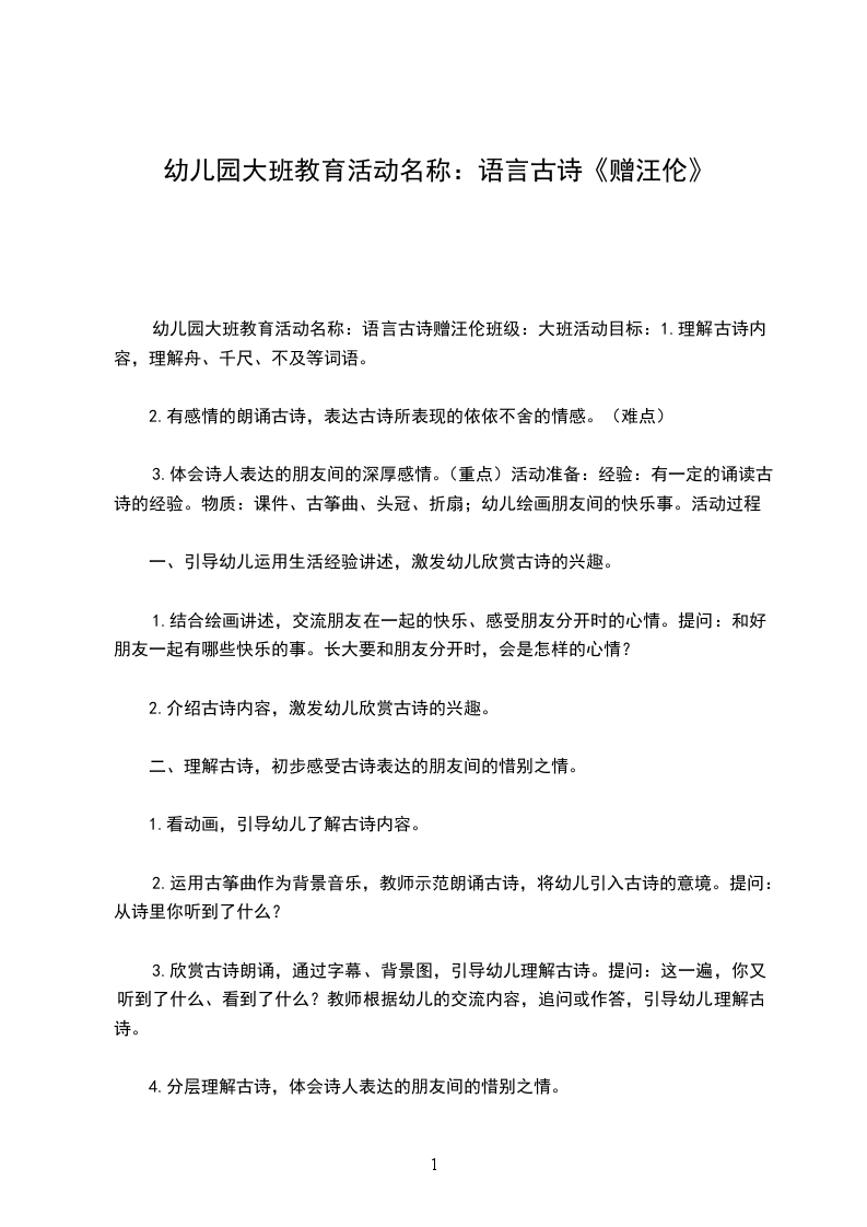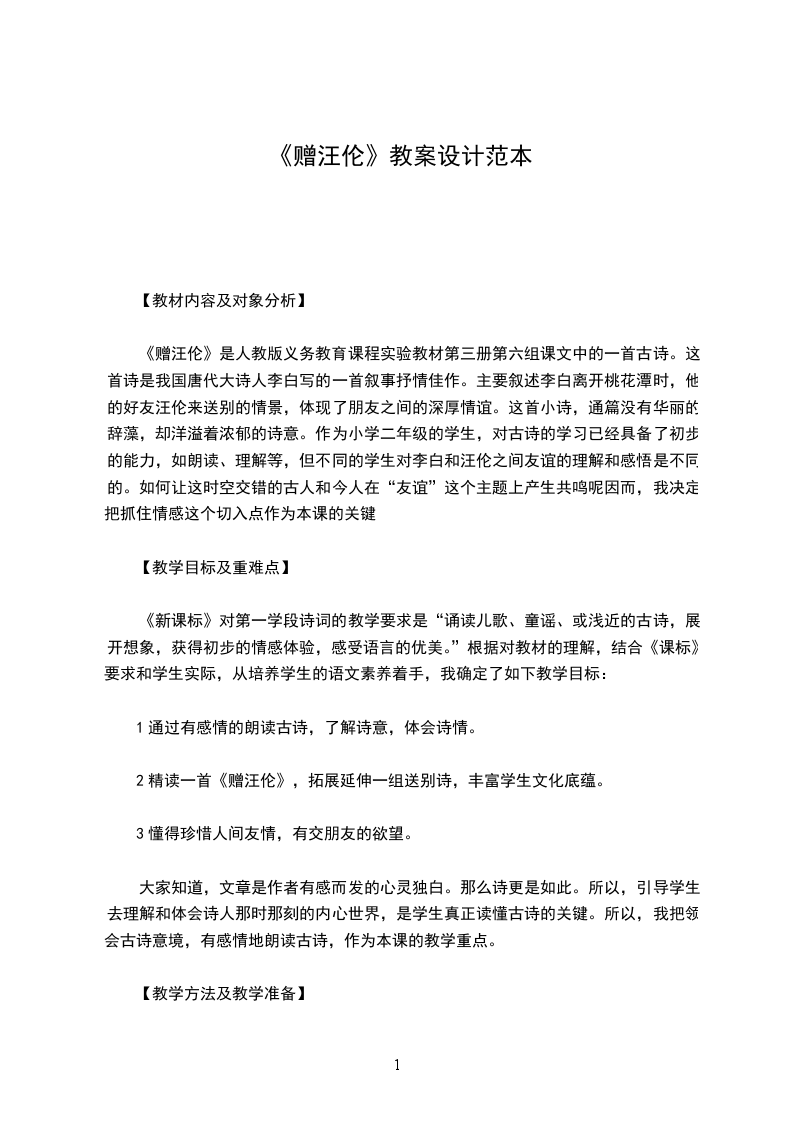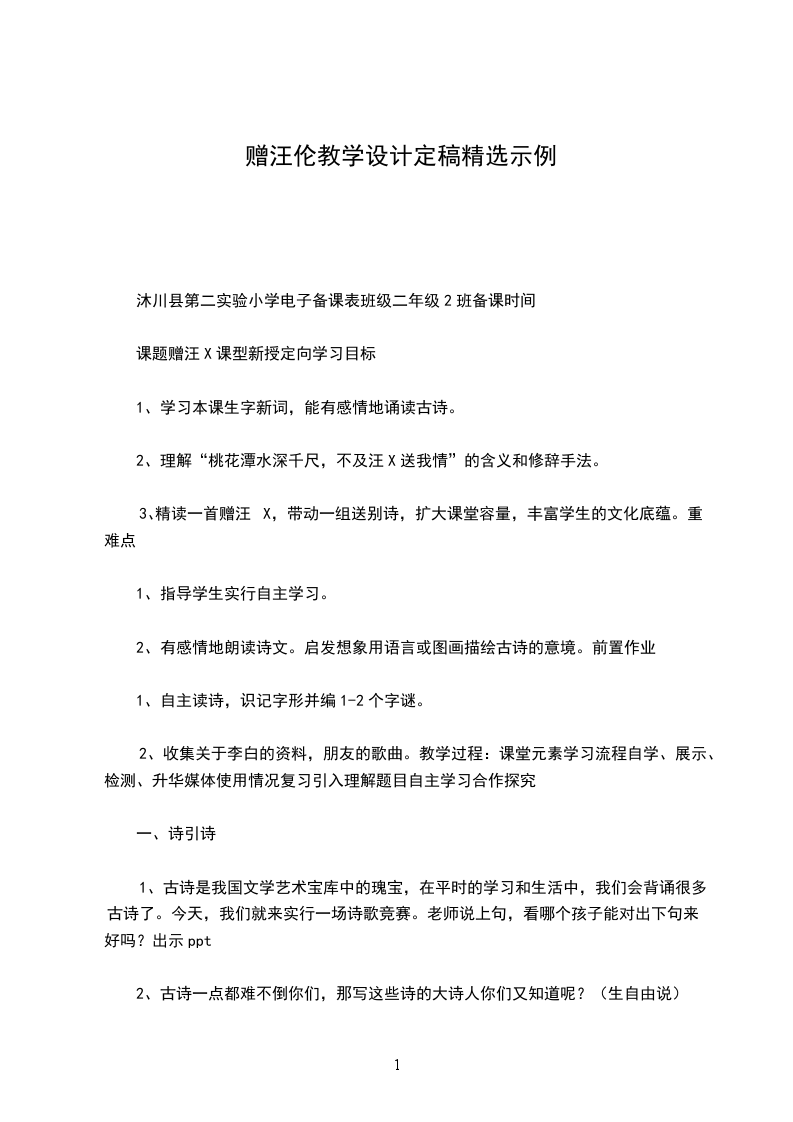 二、交流资料我们刚才吟诵了李X的诗句,通过以前的学习,你对李X有哪些了解?(学生简介李X的生平)李X一生写下了许多脍炙人口的诗,今天咱们再学习一首,请大家齐读诗题-赠汪X。课前我们已经查阅了和课文有关的资料,谁能结合你查阅的资料谈谈你对汪X的了解?(学生交流有关资料)老师也查阅了一些资料,在这本中国名胜大辞典中,我知道李X和汪XX成为好朋友,还有一个非常有趣的小故事,你们想听吗?(师讲故事):内容简介李X一生既喜欢做诗,也很喜欢喝酒和游历名川大山,汪伦非常仰慕他的才华,很想与他结为朋友。于是就写了一封信托人带给李X,上面写道:先生,您喜欢游览吗?这里有十里桃花;您喜欢喝酒吗?这里有万家酒店。李X一看,呀!这么好的地方,我得去看看。可是到了那里,既不见十里桃花,也不见万家酒店,李X疑惑不解。汪伦解释说:十里桃花是十里外有个桃花渡口,万家酒店是有个姓万的人开了一家酒店,并不是一万家酒店。李X恍然大悟,他不但没有生气,反而被汪伦的.幽默与风趣逗得哈哈大笑起来,两人一见如故。在以后的几天里,汪伦每天盛情款待李X,并带他游遍了当地的名山胜景,他们一起饮酒作诗,情趣相投,短短几天就结下了深厚的友谊。临别时,汪伦踏歌相送,李X被他的真诚深深地感动了,即兴吟诗一首-赠汪伦。设计意图通过资源共享,使学生对李X与汪伦有进一步的了解,并产生浓厚的学习兴趣。