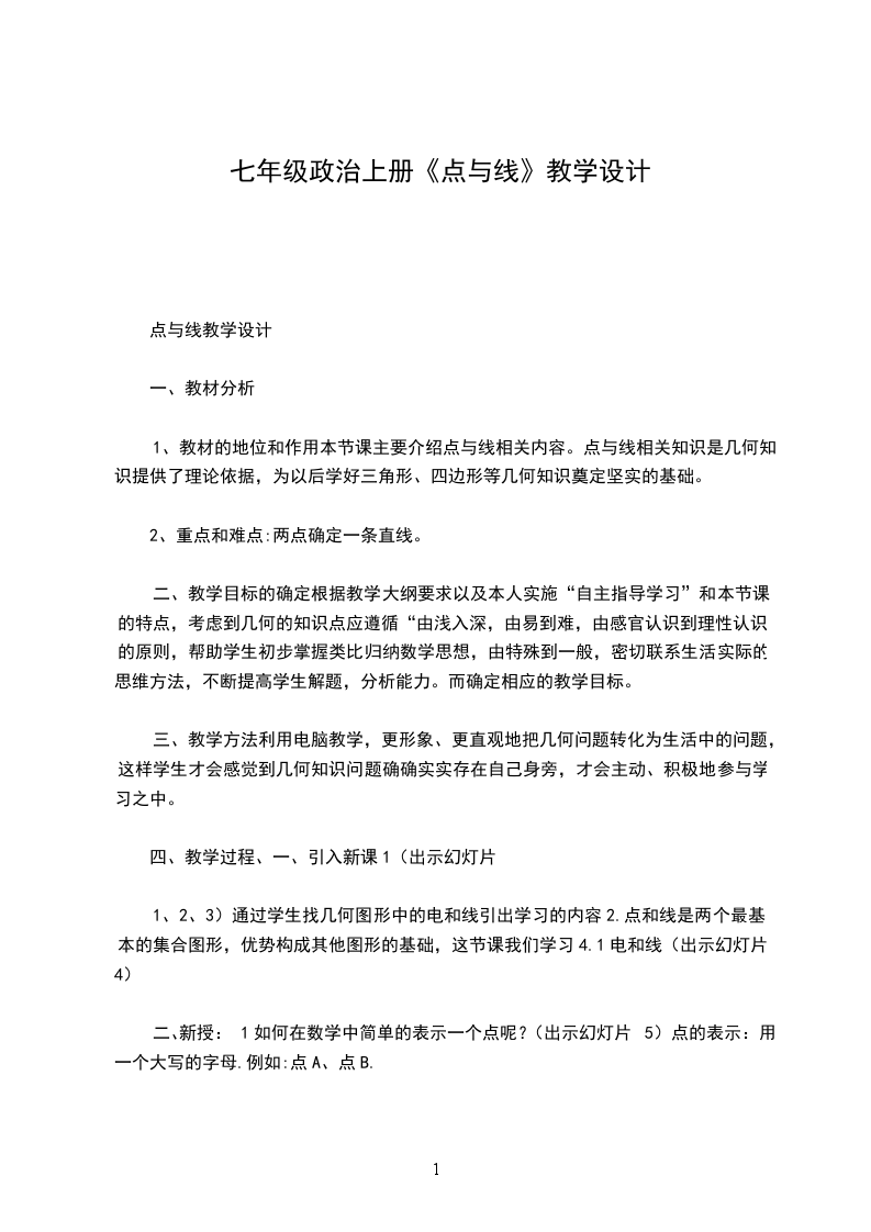 第三课:新的起点教学设计【教学依据】明确一个人要有理想,要脚踏实地去做这样理想才会变成现实【教学目标】情感、态度、价值观:树立远大理想,坚定信念,从现在做起,扬帆起航,驶向理想的彼岸。能力:明确理想、计划、行动三者之间的关系,进一步增强行动意识。知识:理想的重要性,学会制定计划。【教学准备】搜集有关理想的名言名句、事例,有关理想的实现必须靠努力去实践的案例【教学活动】(环节一)创设情景,导入课题“新的起点”多媒体展示:“新的起航”。学生看大屏幕,联系自己的学习生活实际。从而引发学生的联想:我们正处于新的起点!师引导:我们们从小学到初中,我们又站在了一个全新的起点上了。新的起点,新的目标,新的开始!让我们于的起点向新的目标前进!师板书:新的起点(环节二)放飞理想活动:学生以学习小组为单位,讨论自己的理想是什么?确立理想的重要性。活动展示:我来谈。各组出一名代表谈理想多媒体展示:理想是石,敲出星星之火;理想是火,点燃熄灭的灯;理想是灯,照亮夜行的路;理想是路,引你走到黎明;理想开花,桃李要结甜果;理想抽芽,榆杨会有浓荫;请乘理想之马,挥鞭从此启程,路上春色正好,天上太阳正晴。学生齐读诗歌师总结:我们开始了新的征程,正准备扬帆起航开始我们新的航程,我们要明确目标,树立理想,是我们走向成功的第一步!(环节三)凡事预则立,不预则废师:同学们有了明确的目标,树立的远大的理想,就能到达胜利的彼岸吗?多媒体展示:小X的故事活动:生讨论.学生讨论后发言,教师根据学生的发言引导学生要制定具体的计划结论:凡事预则立,不预则废学生活动:讨论怎样制定好计划学生发言教师总结: