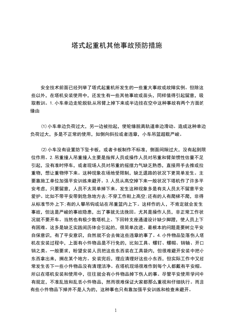 (2)小车没有设置防下坠卡板,或者卡板制作不标准,侧面间隙过大,没有起到限位作用。2.吊重撞人吊重撞人主要是指挥人员或操作人员对吊重和臂架惯性估量不足引起,没有准时停车,或者现场人员对吊重的摇摆力气缺乏熟悉,直接用手去推或拉重物,想让重物停下来。这种现象在场地受限制,缺乏退路的状况下更简单发生。主要靠施工单位加强平安训练来避开。3.人员从高空掉下来一般状况下塔机作了许多平安考虑,只要留意,人员不太简单掉下来。发生这种现象多是有关人员太不留意平安爱护。比如不带平安带到危急地方去;不穿工作鞋上高空;还有的人有爬梯不爬,非得从标准节外上下;有的人攀吊钩或站在吊重篮内上下。这样作的人,不肯定就会发生事故,但这是严峻的事故隐患,出了事就无法挽回。尤其是操作人员,非正常工作状况就不要开车。当然也有极少数塔机上、下回转支座通道设计缺少脚蹬,使人员上下有困难。这多是缺乏实践阅历体会引起的,很简单改进。最根本的问题是要树立平安自保意识,有了平安意识,自然就不会去做这些违章的事了。4.小件物品坠落伤人塔机在安装过程中,上面有小件物品是不行免的,比如工具、螺钉、螺帽、销轴、开口销之类。一般要求,盼望安装人员把这些东西装在工具袋内,但很难避开安装中把小东西拿出来,搁在某个地方。安装完后,理应清理好这些小东西,但实际工作中又经常发生丢下一些小件物品没有清理洁净。在塔机现场很难作到每个人都戴有平安帽。所以在塔机安装和使用中,往往就会有小件物品掉下伤人的事。尽管平安使用学问中有规定,不准乱放和乱丢小件物品,然而很难保证大家都那么重视和仔细执行。而且有些小件物品下掉并不是人为的,这种事也只有靠加强平安训练和检查来避开。