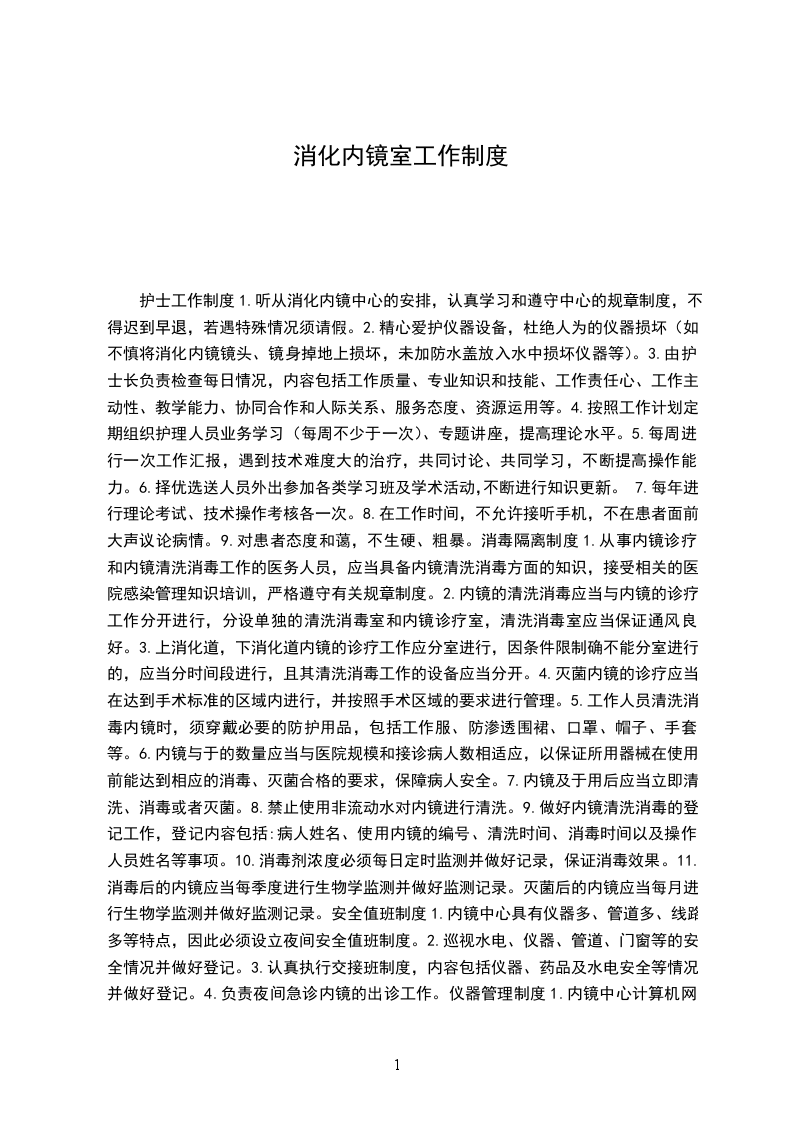 护士工作制度1.听从消化内镜中心的安排,认真学习和遵守中心的规章制度,不得迟到早退,若遇特殊情况须请假。2.精心爱护仪器设备,杜绝人为的仪器损坏(如不慎将消化内镜镜头、镜身掉地上损坏,未加防水盖放入水中损坏仪器等)。3.由护士长负责检查每日情况,内容包括工作质量、专业知识和技能、工作责任心、工作主动性、教学能力、协同合作和人际关系、服务态度、资源运用等。4.按照工作计划定期组织护理人员业务学习(每周不少于一次)、专题讲座,提高理论水平。5.每周进行一次工作汇报,遇到技术难度大的治疗,共同讨论、共同学习,不断提高操作能力。6.择优选送人员外出参加各类学习班及学术活动,不断进行知识更新。7.每年进行理论考试、技术操作考核各一次。8.在工作时间,不允许接听手机,不在患者面前大声议论病情。9.对患者态度和蔼,不生硬、粗暴。消毒隔离制度1.从事内镜诊疗和内镜清洗消毒工作的医务人员,应当具备内镜清洗消毒方面的知识,接受相关的医院感染管理知识培训,严格遵守有关规章制度。2.内镜的清洗消毒应当与内镜的诊疗工作分开进行,分设单独的清洗消毒室和内镜诊疗室,清洗消毒室应当保证通风良好。3.上消化道,下消化道内镜的诊疗工作应分室进行,因条件限制确不能分室进行的,应当分时间段进行,且其清洗消毒工作的设备应当分开。4.灭菌内镜的诊疗应当在达到手术标准的区域内进行,并按照手术区域的要求进行管理。5.工作人员清洗消毒内镜时,须穿戴必要的防护用品,包括工作服、防渗透围裙、口罩、帽子、手套等。6.内镜与于的数量应当与医院规模和接诊病人数相适应,以保证所用器械在使用前能达到相应的消毒、灭菌合格的要求,保障病人安全。7.内镜及于用后应当立即清洗、消毒或者灭菌。8.禁止使用非流动水对内镜进行清洗。9.做好内镜清洗消毒的登记工作,登记内容包括:病人姓名、使用内镜的编号、清洗时间、消毒时间以及操作人员姓名等事项。10.消毒剂浓度必须每日定时监测并做好记录,保证消毒效果。11.消毒后的内镜应当每季度进行生物学监测并做好监测记录。灭菌后的内镜应当每月进行生物学监测并做好监测记录。安全值班制度1.内镜中心具有仪器多、管道多、线路多等特点,因此必须设立夜间安全值班制度。2.巡视水电、仪器、管道、门窗等的安全情况并做好登记。3.认真执行交接班制度,内容包括仪器、药品及水电安全等情况,并做好登记。4.负责夜间急诊内镜的出诊工作。仪器管理制度1.内镜中心计算机网络为储存内镜资料专用,不得使用其他应用软件,以防病毒感染,保障网络安全。2.内镜中心须有专人管理网络,上岗前须经培训。3.内镜资料入库前,须保证其各项信息的准确性。4.当资料录入错误时,应及时报告,请专人修改。5.所有仪器必须造册登记,使用后认真保养,未使用仪器每星期必须检查保养一次。6.仪器使用必须按操作规程,如有违反,中心技师有权随时终止使用。7.各种仪器出入、维修及报废必须做好登记,内容包括日期、型号、维修原因及签名等,以保证检查、治疗顺利进行。8.中心所有仪器、物品未经允许进修医师一律不准动用。9.进修医师所带仪器、器材,进出都必须由中心技师验收清点。10.仪器损坏后,必须及时向领导汇报,不得隐瞒,否则按相应政策给予严肃处理。11.12.13.14.15.16.17.