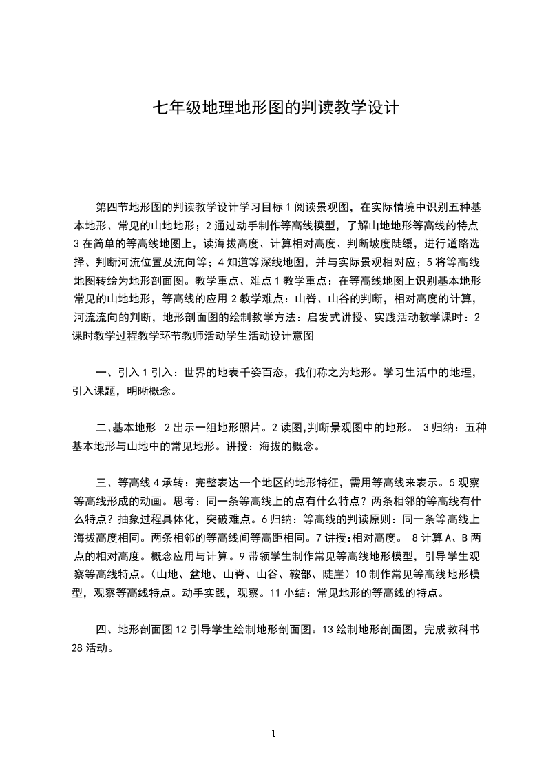 第四节地形图的判读教学设计学习目标1阅读景观图,在实际情境中识别五种基本地形、常见的山地地形;2通过动手制作等高线模型,了解山地地形等高线的特点;3在简单的等高线地图上,读海拔高度、计算相对高度、判断坡度陡缓,进行道路选择、判断河流位置及流向等;4知道等深线地图,并与实际景观相对应;5将等高线地图转绘为地形剖面图。教学重点、难点1教学重点:在等高线地图上识别基本地形、常见的山地地形,等高线的应用2教学难点:山脊、山谷的判断,相对高度的计算,河流流向的判断,地形剖面图的绘制教学方法:启发式讲授、实践活动教学课时:2课时教学过程教学环节教师活动学生活动设计意图