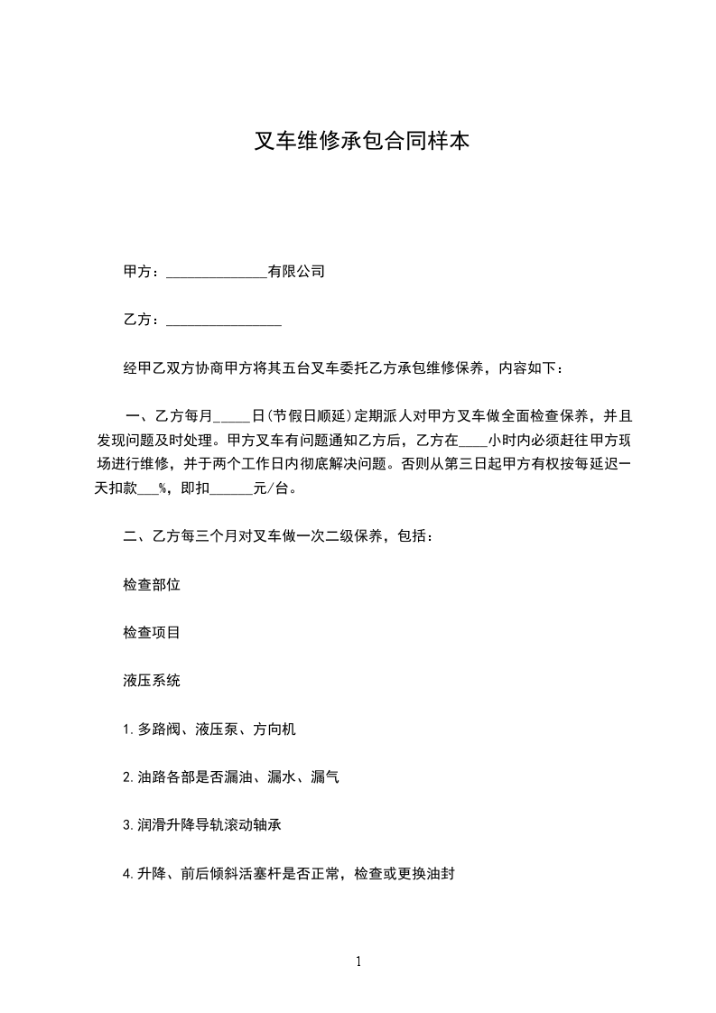 一、乙方每月_____日(节假日顺延)定期派人对甲方叉车做全面检查保养,并且发现问题及时处理。甲方叉车有问题通知乙方后,乙方在____小时内必须赶往甲方现场进行维修,并于两个工作日内彻底解决问题。否则从第三日起甲方有权按每延迟一天扣款___%,即扣______元/台。