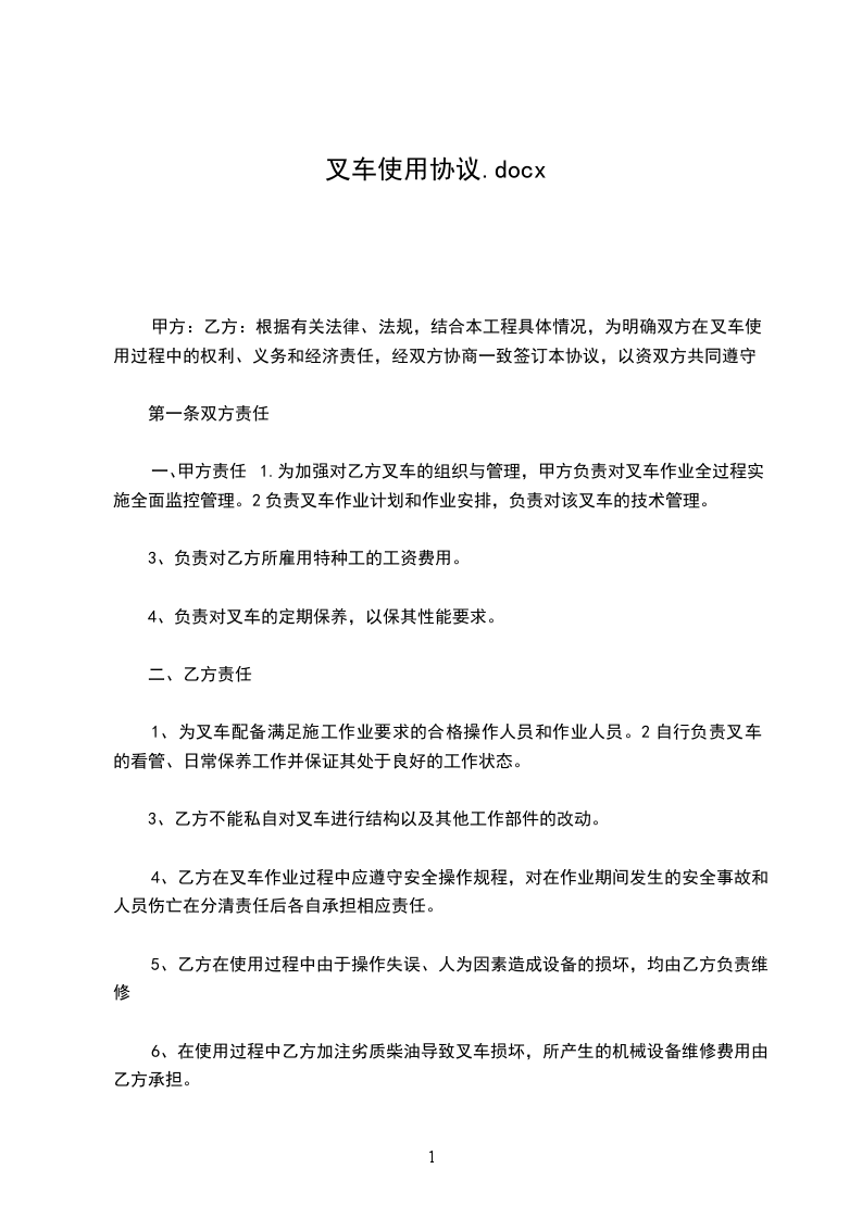 甲方:乙方:根据有关法律、法规,结合本工程具体情况,为明确双方在叉车使用过程中的权利、义务和经济责任,经双方协商一致签订本协议,以资双方共同遵守。