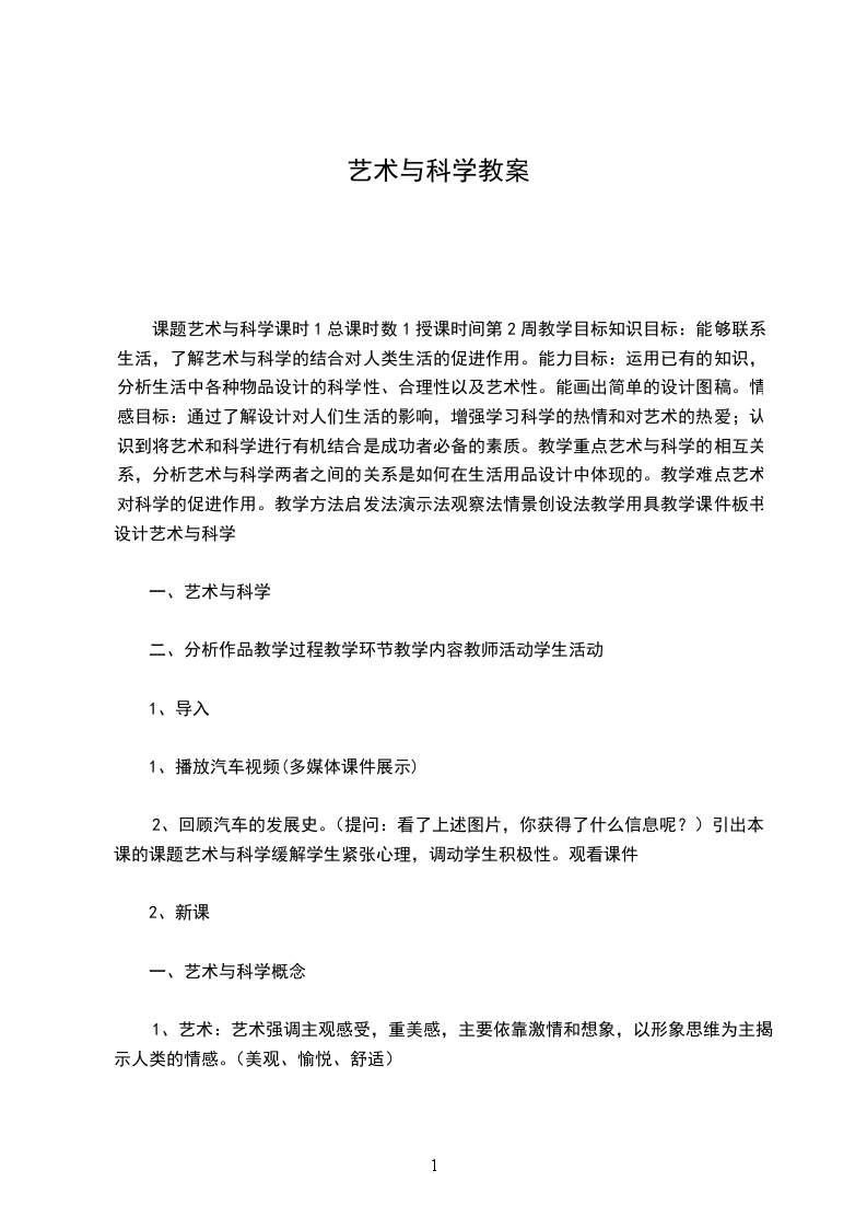 课题艺术与科学课时1总课时数1授课时间第2周教学目标知识目标:能够联系生活,了解艺术与科学的结合对人类生活的促进作用。能力目标:运用已有的知识,分析生活中各种物品设计的科学性、合理性以及艺术性。能画出简单的设计图稿。情感目标:通过了解设计对人们生活的影响,增强学习科学的热情和对艺术的热爱;认识到将艺术和科学进行有机结合是成功者必备的素质。教学重点艺术与科学的相互关系,分析艺术与科学两者之间的关系是如何在生活用品设计中体现的。教学难点艺术对科学的促进作用。教学方法启发法演示法观察法情景创设法教学用具教学课件板书设计艺术与科学