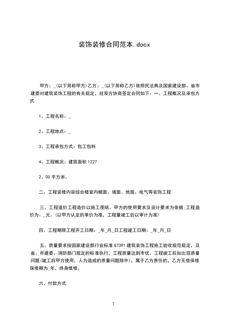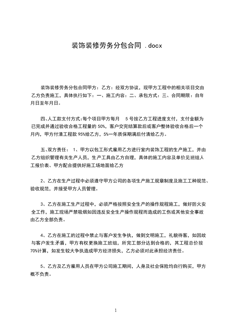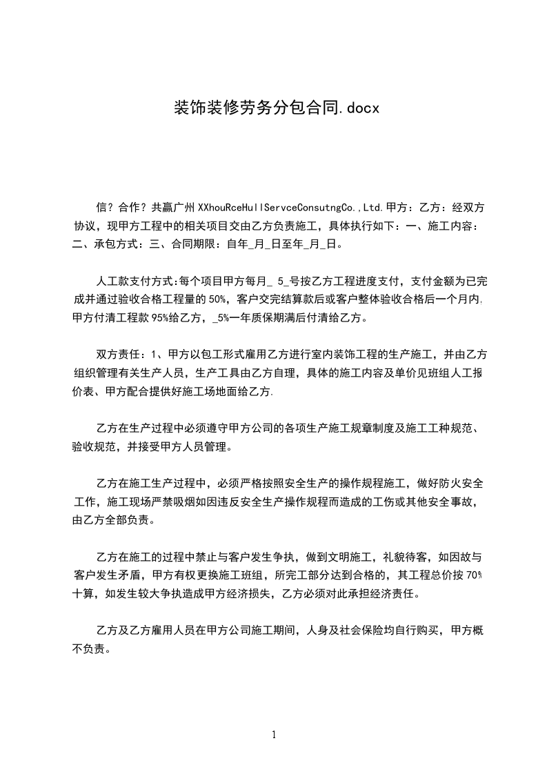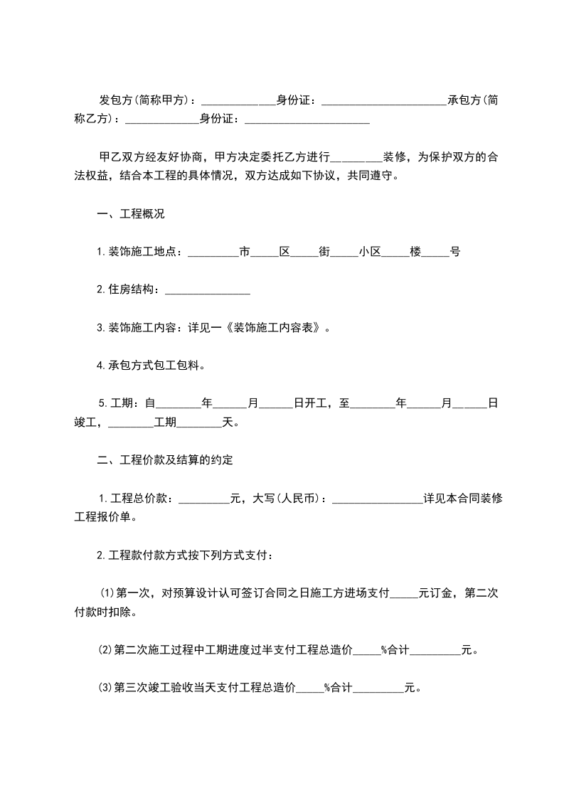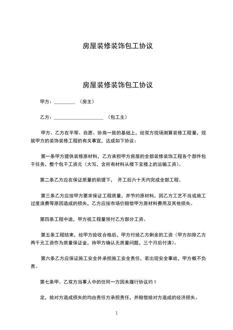 第一条甲方提供装修原材料,乙方承担甲方房屋的全部装修装饰工程各个部件包干任务,整个包干工资_元(大写_,含所有材料从楼下至楼上的运输工资)。
